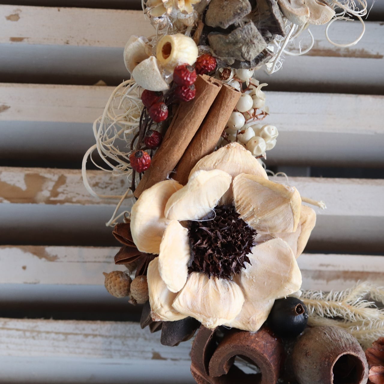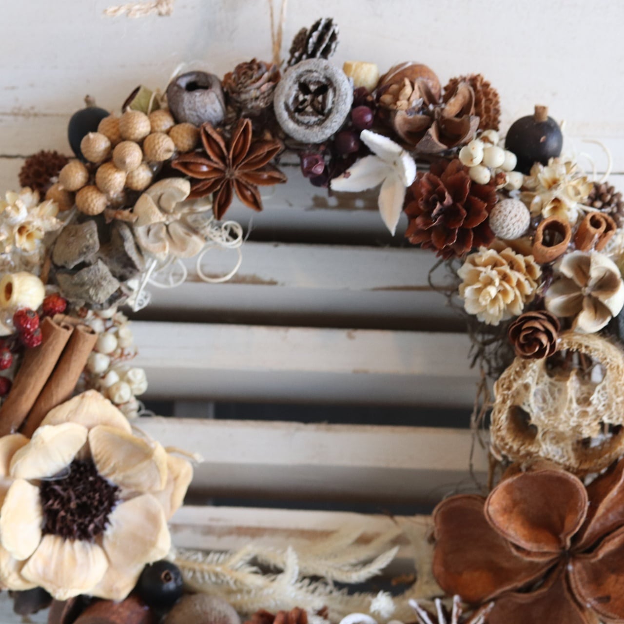 ふっくらと存在感のあるロータスフラワーをメインに、シナモンやアニス、ミニ松ぼっくりなど、さまざまな自然素材を贅沢にあしらいました。