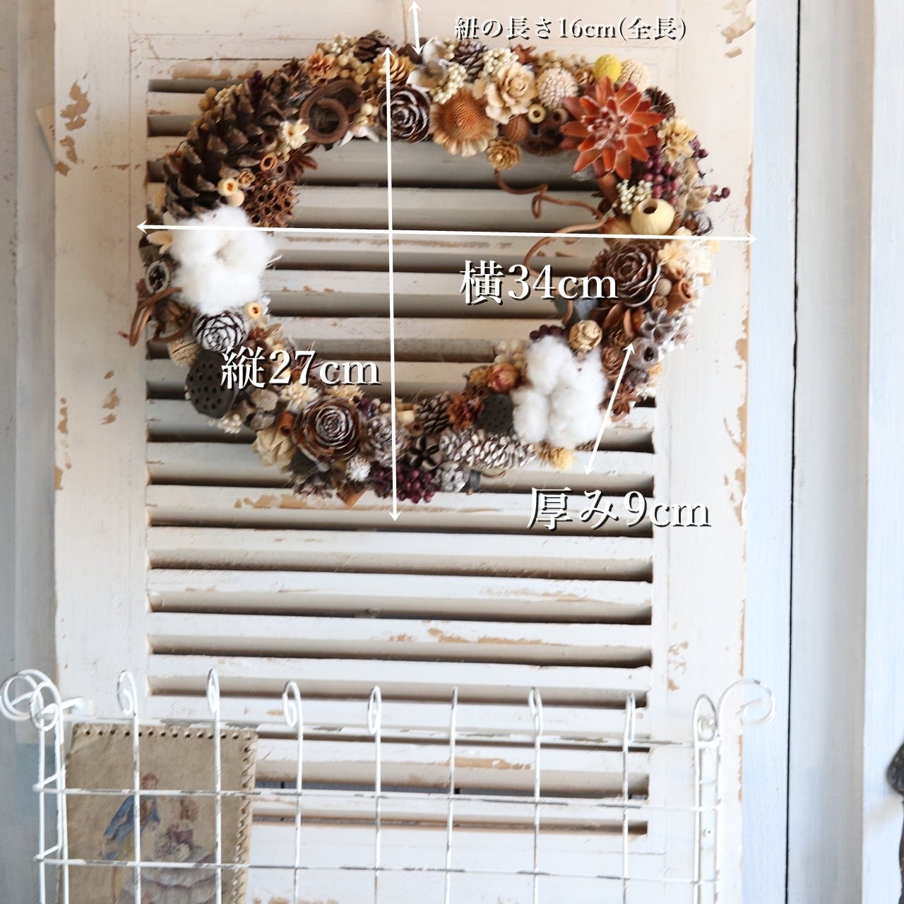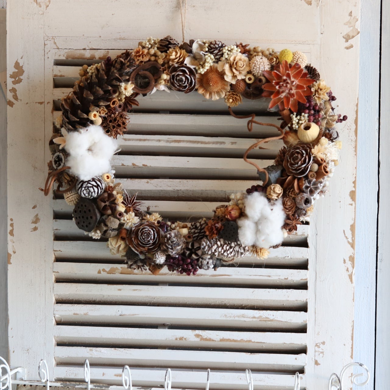 ナチュラルな木の実をぎゅっと詰め込んだ、特に秋冬にぴったりのリースです。色変わりなどがないためオールシーズン飾っていただけるものです。