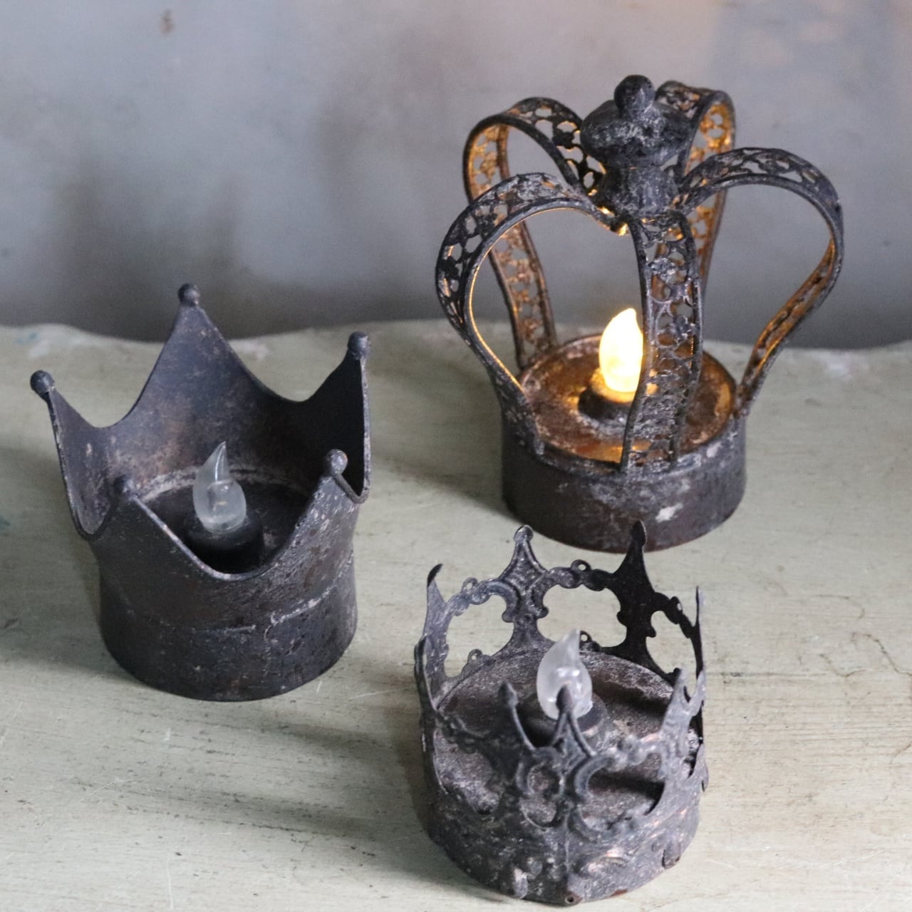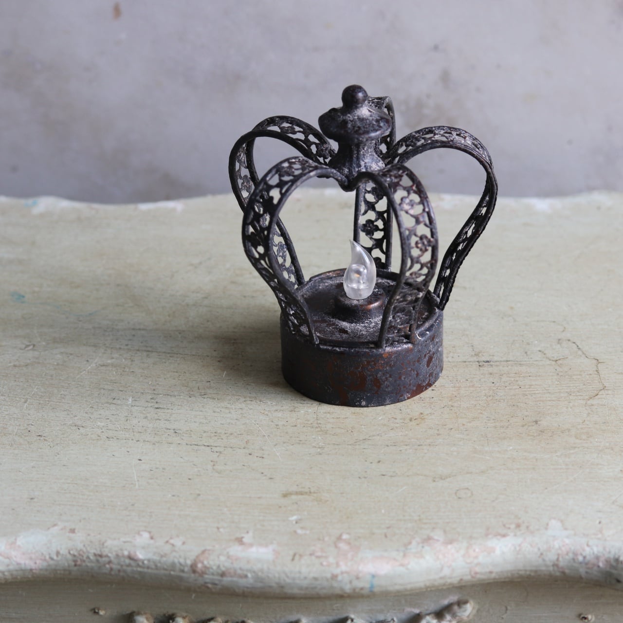 ブリキ素材を使ったシャビーシックな王冠型のキャンドル風ライトです。