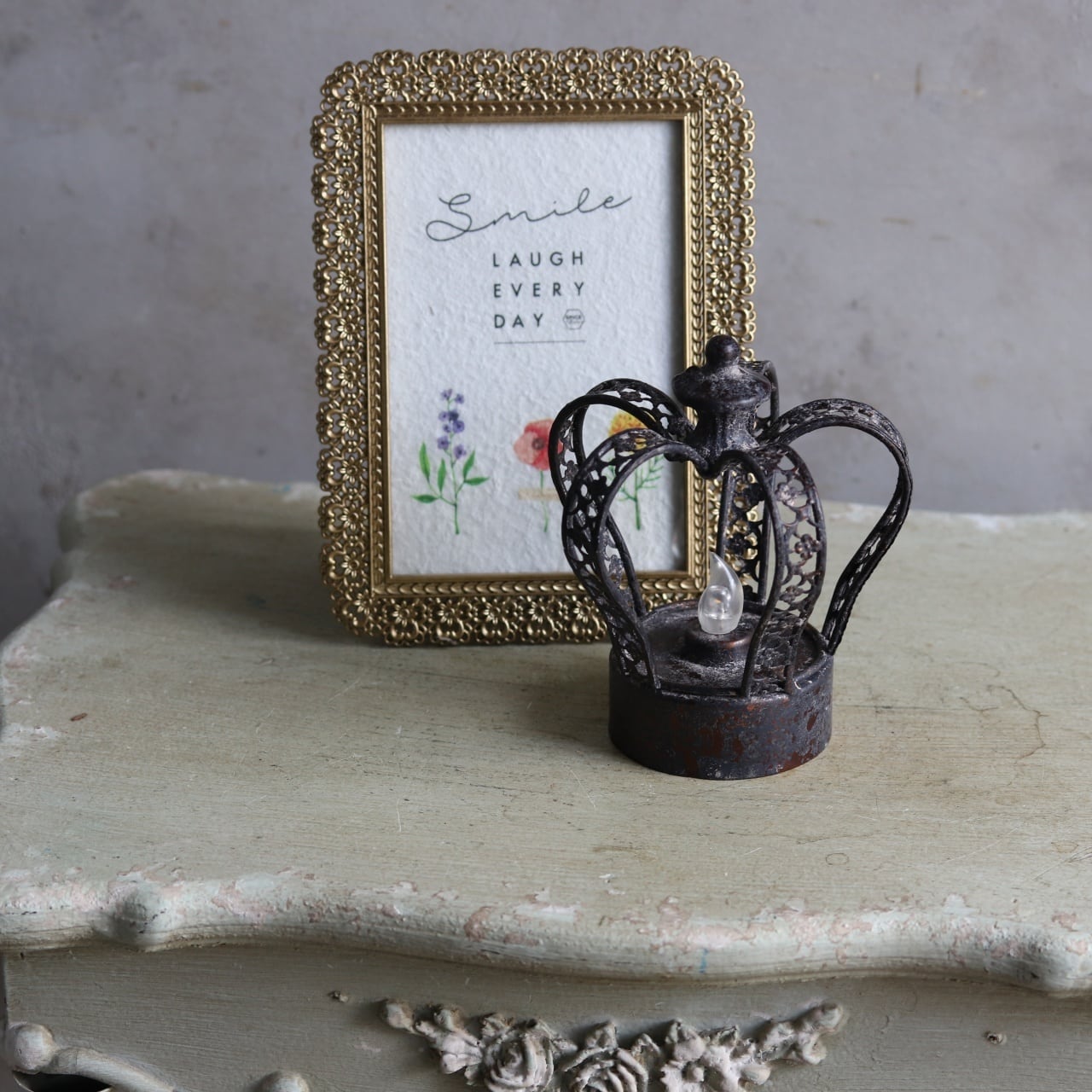 ブリキの質感と王冠モチーフが、アンティーク雑貨のようにインテリアに溶け込みます。