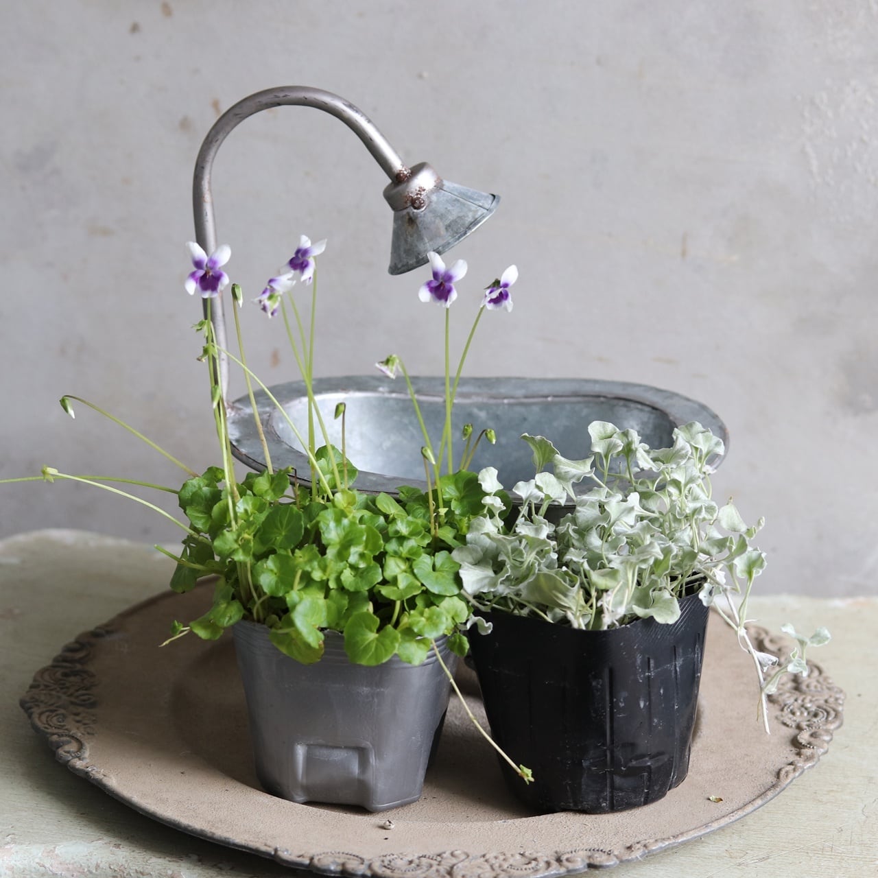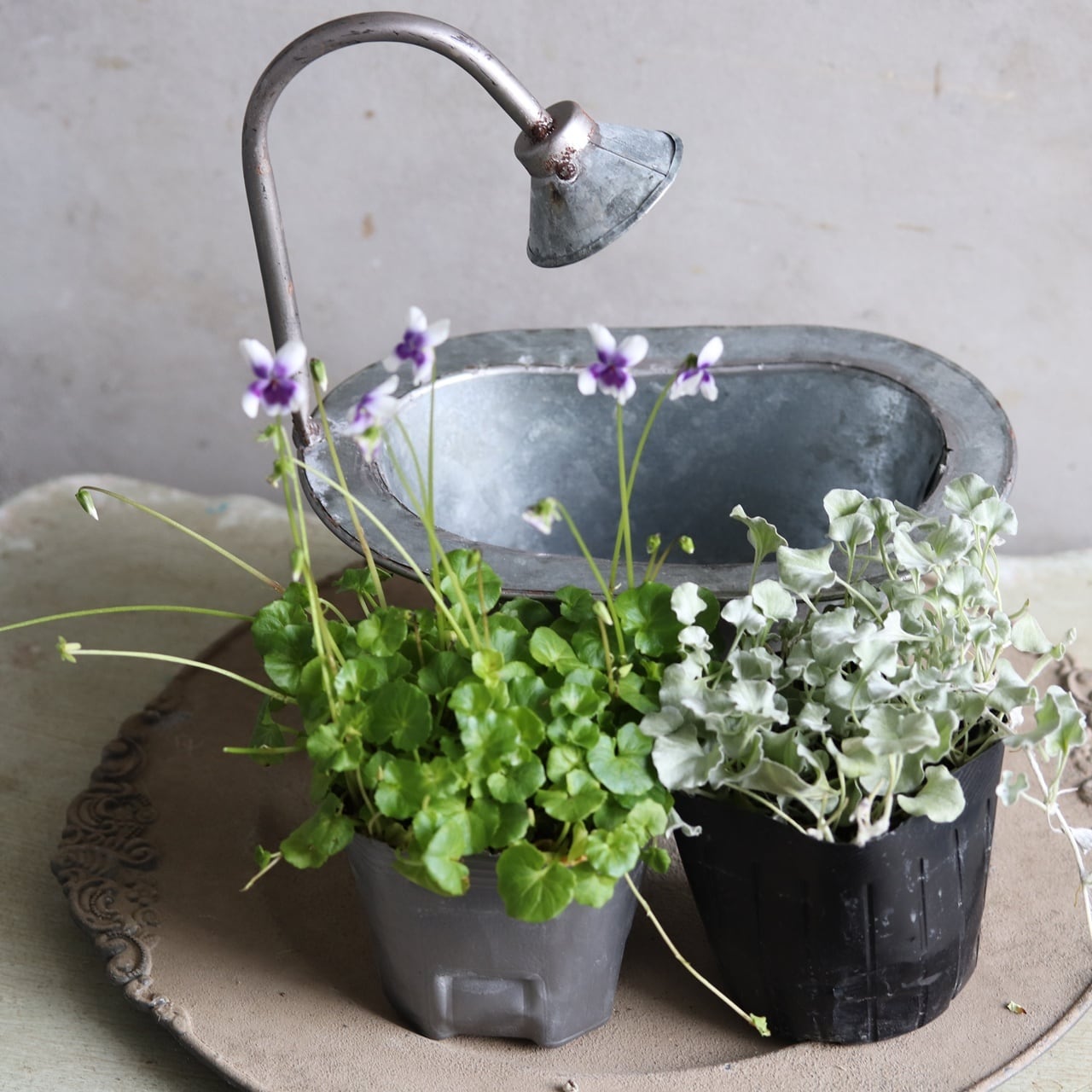 今人気のバスタブデザインのブリキポットに植え込んだ