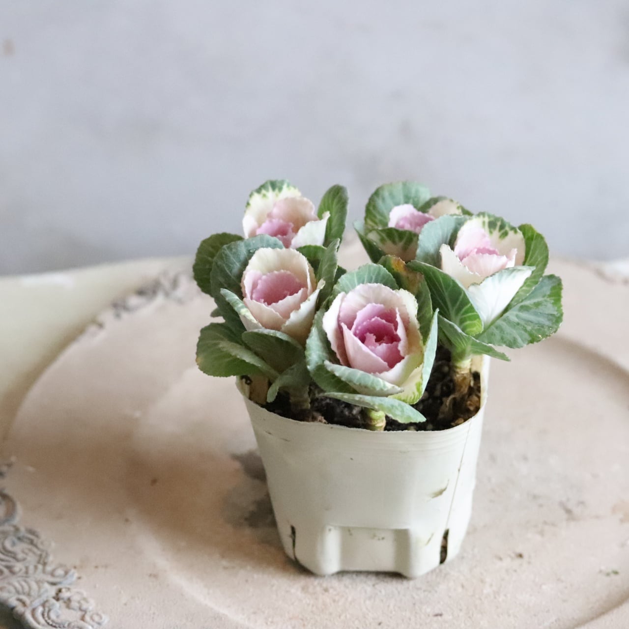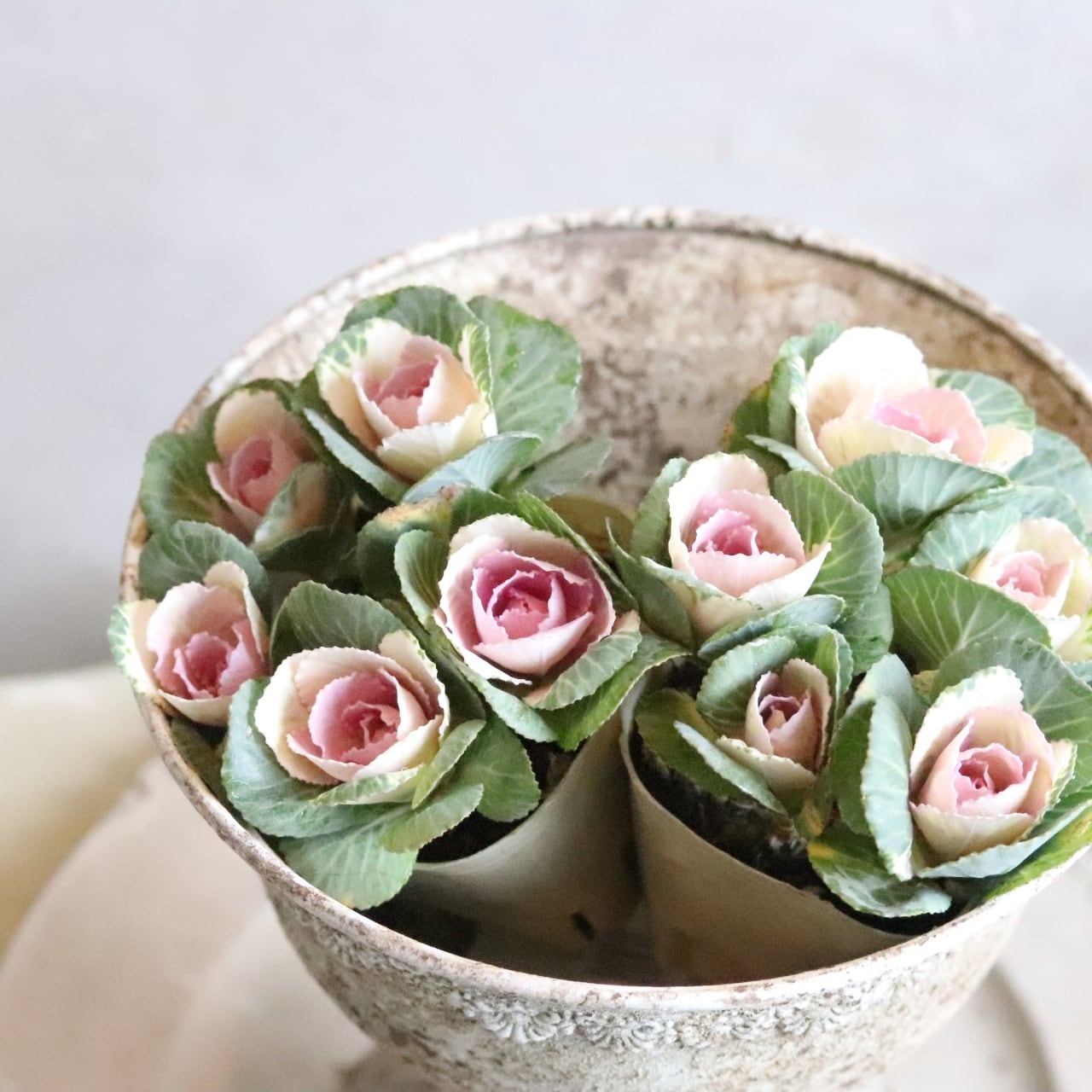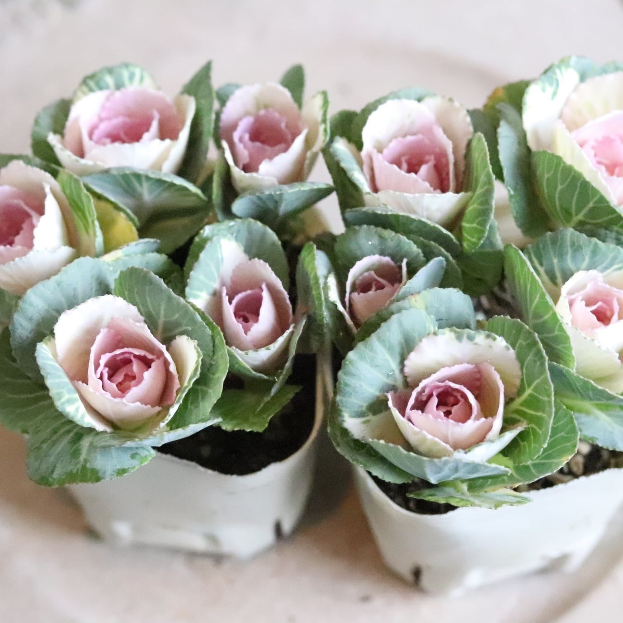 優しい中がピンク色になるバラのような葉ボタン。