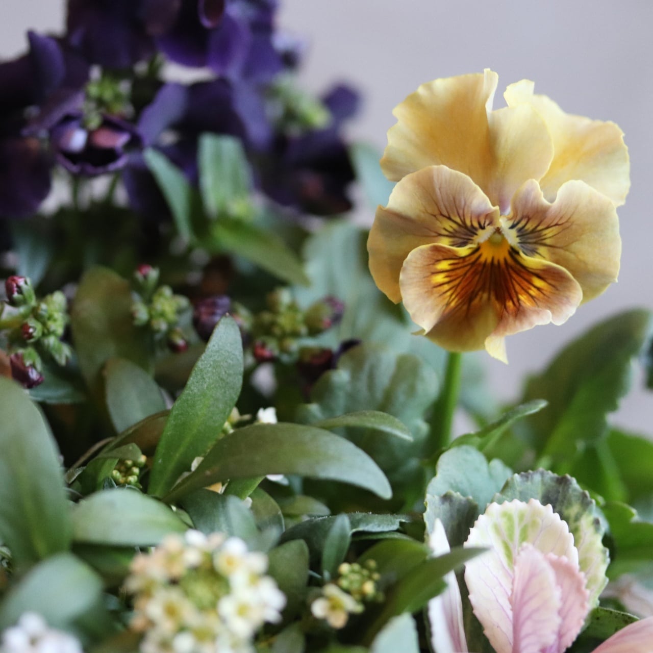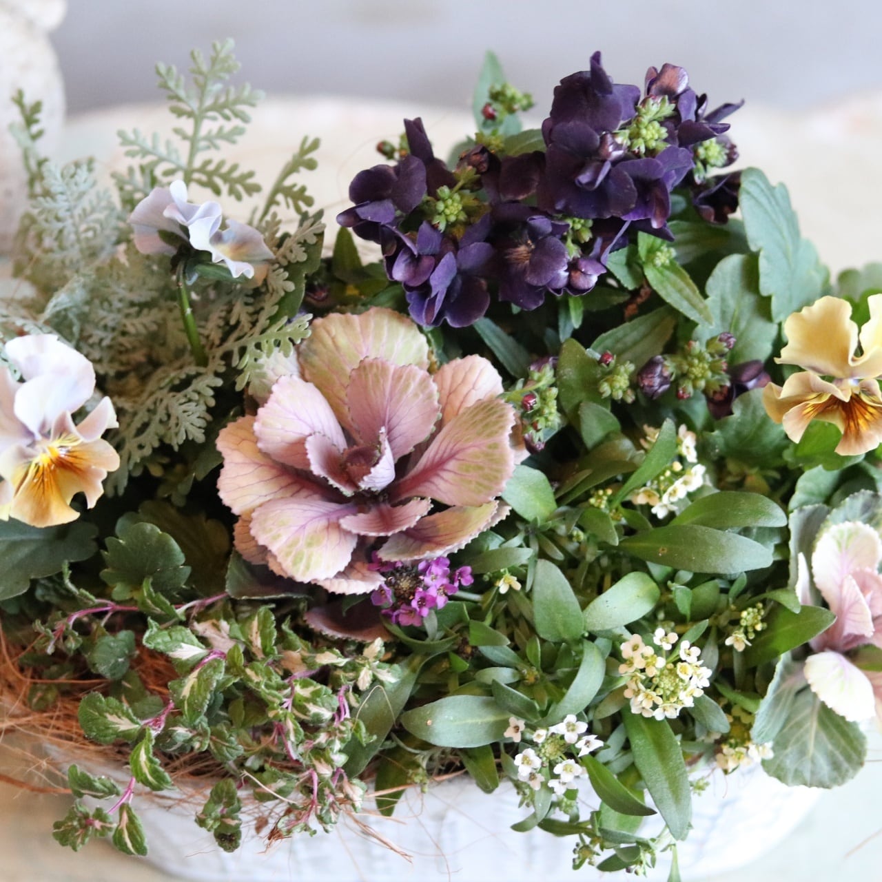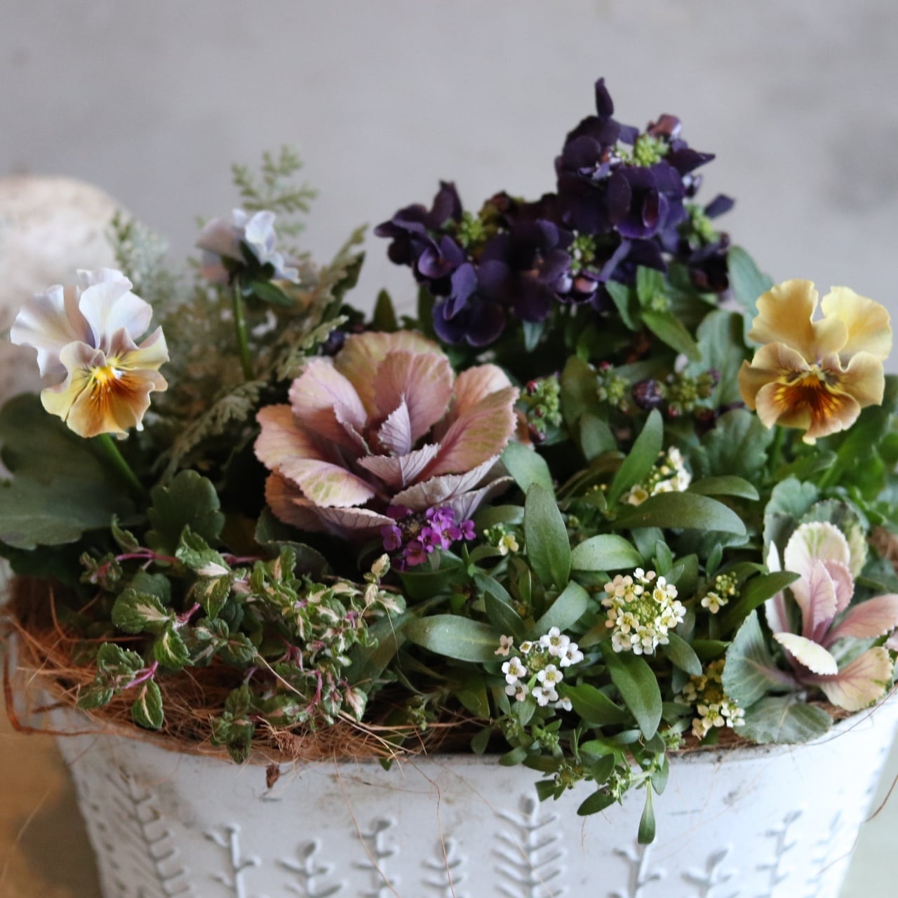 冬から春に楽しむ寄せ植え 和モダンビオラとシックカラーハボタンの北欧風ブリキの寄せ植え 届いてすぐ玄関に飾れる プレゼントにもオススメ