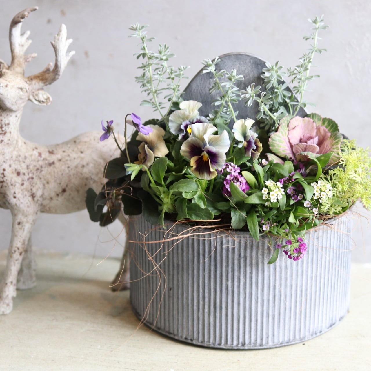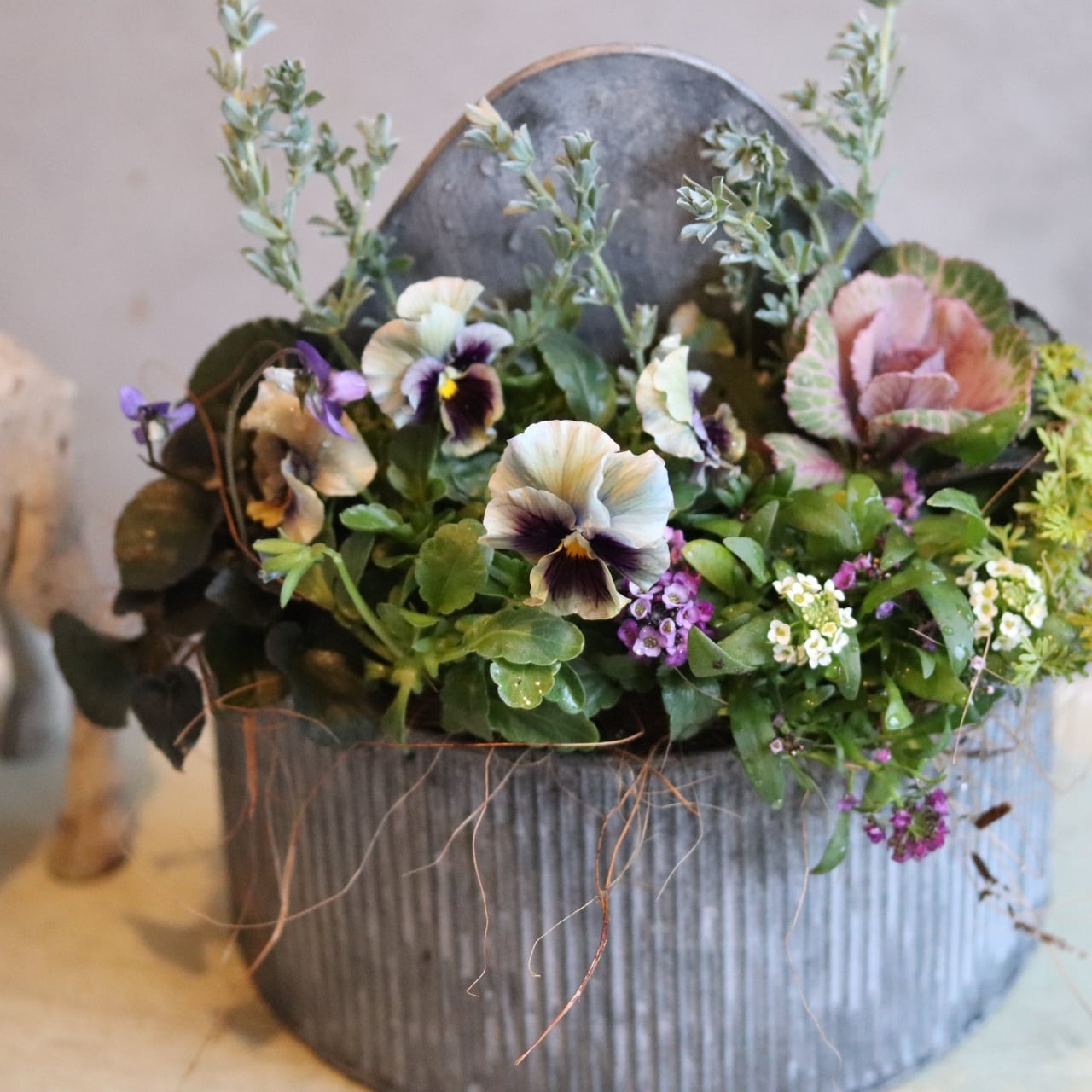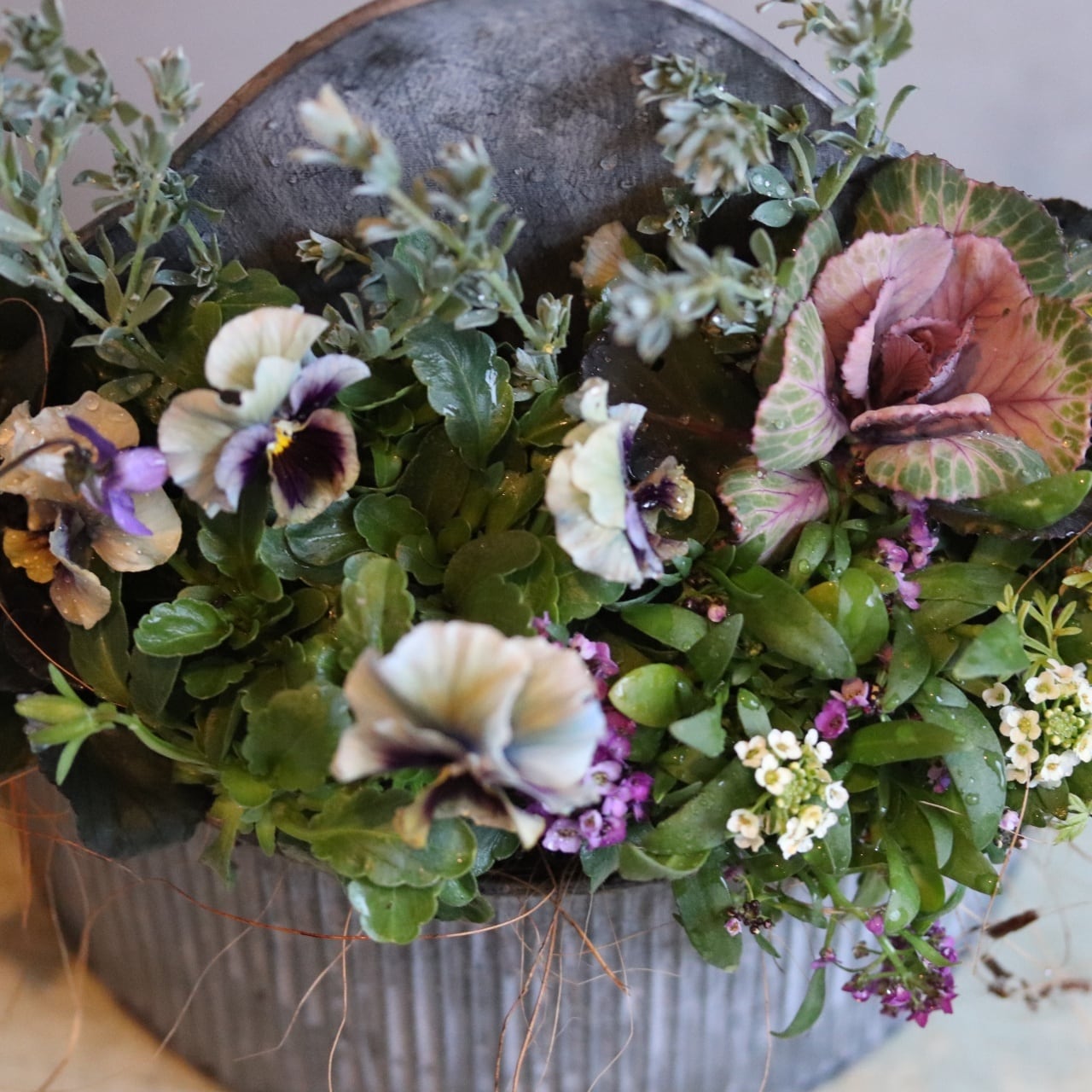 冬から春に楽しむ寄せ植え パンジーマシェリマダムのシックなハボタンのハングブリキの寄せ植え お正月にオススメ 届いてすぐ玄関に飾れる プレゼントにもオススメ