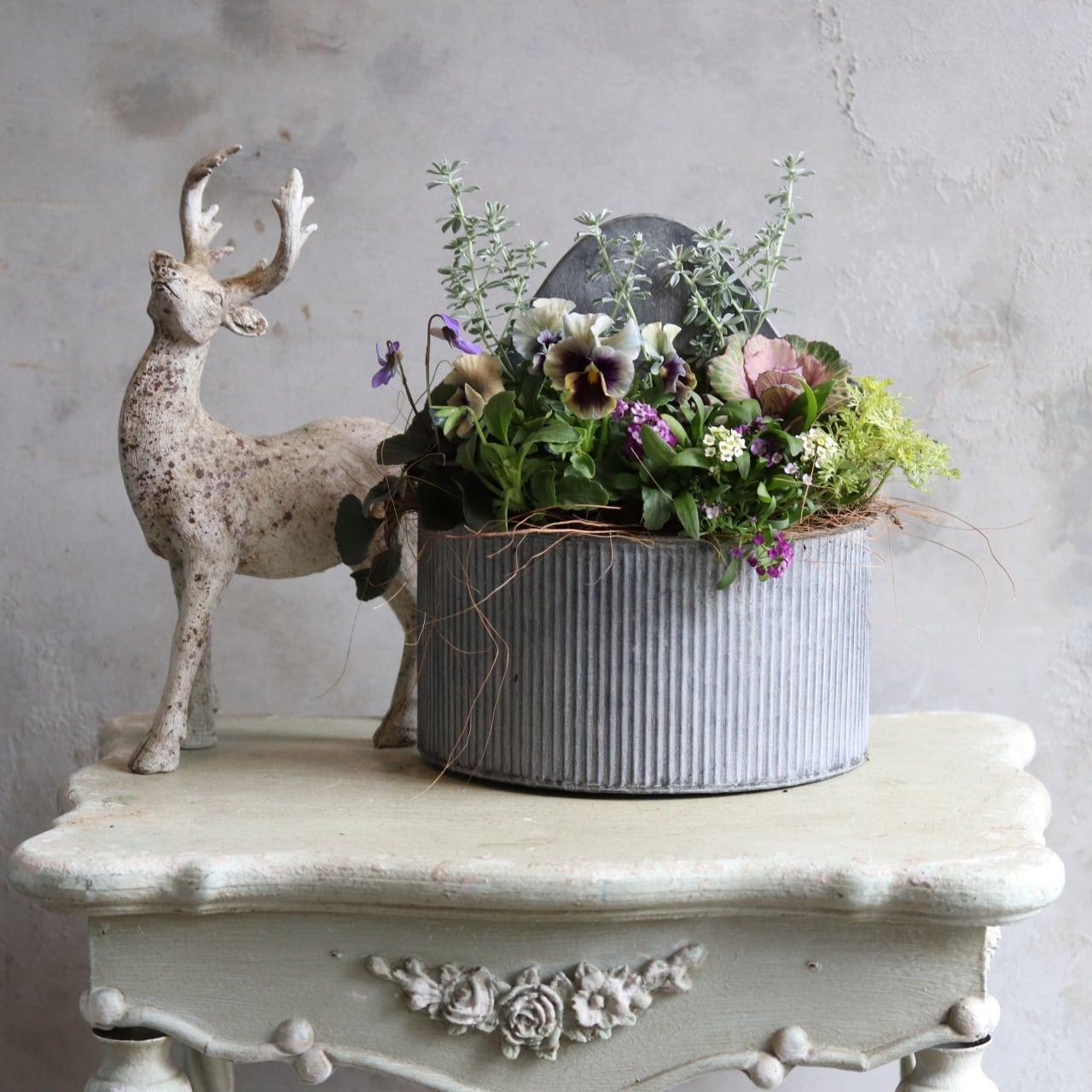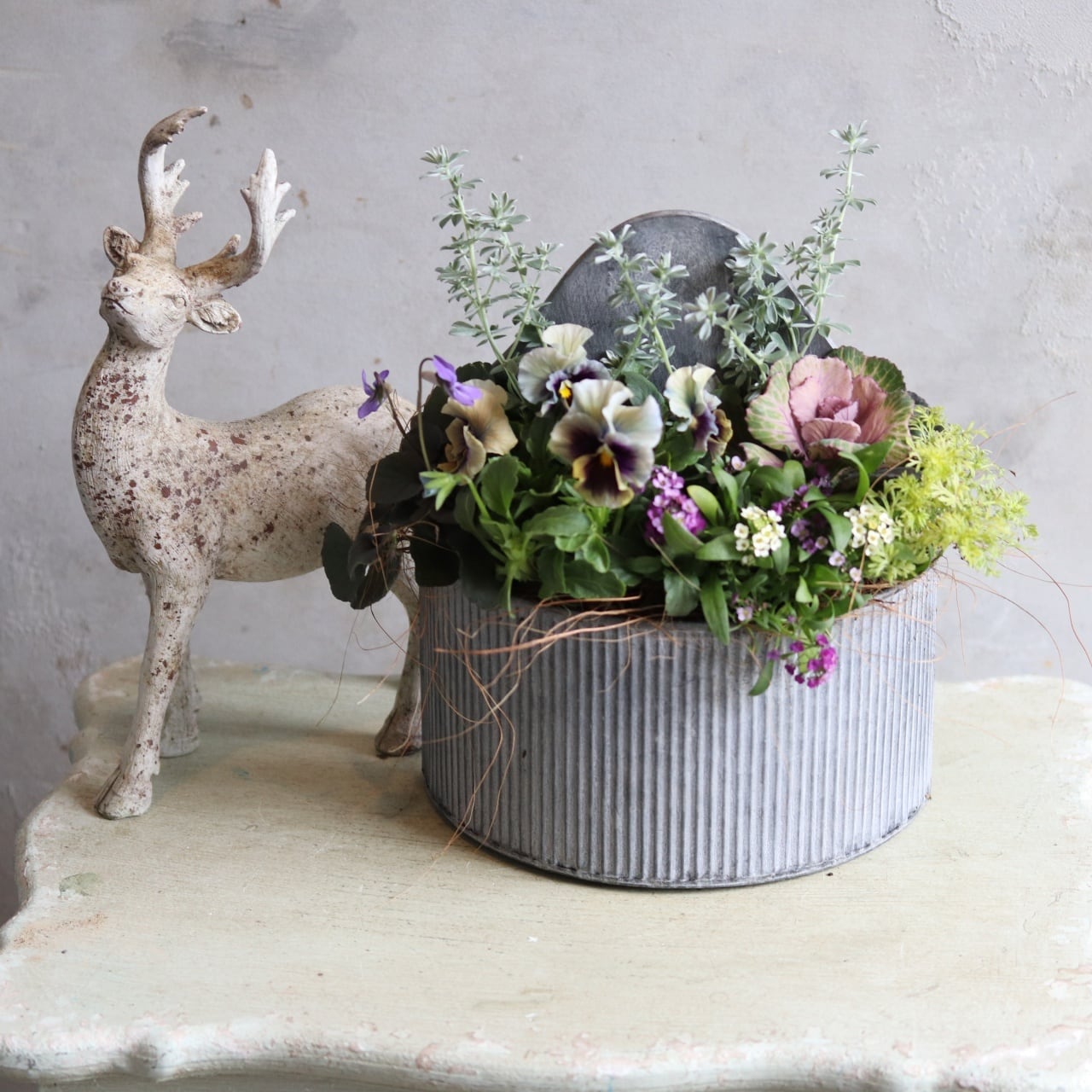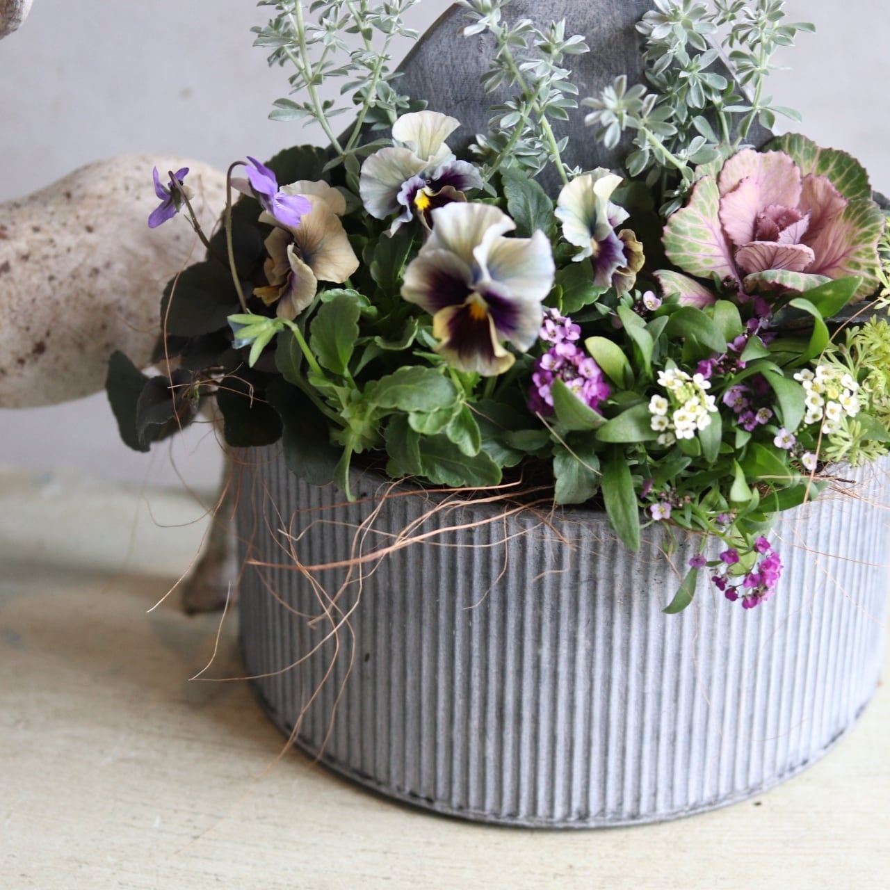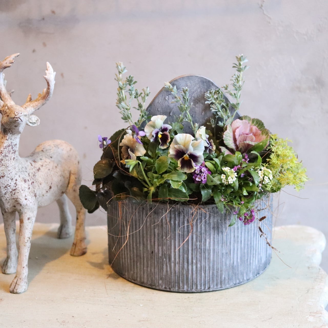 冬から春に楽しむ寄せ植え パンジーマシェリマダムのシックなハボタンのハングブリキの寄せ植え お正月にオススメ 届いてすぐ玄関に飾れる プレゼントにもオススメ