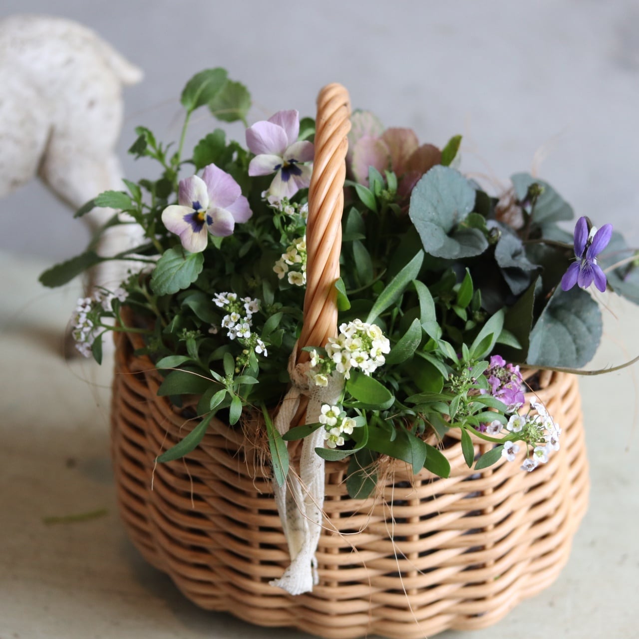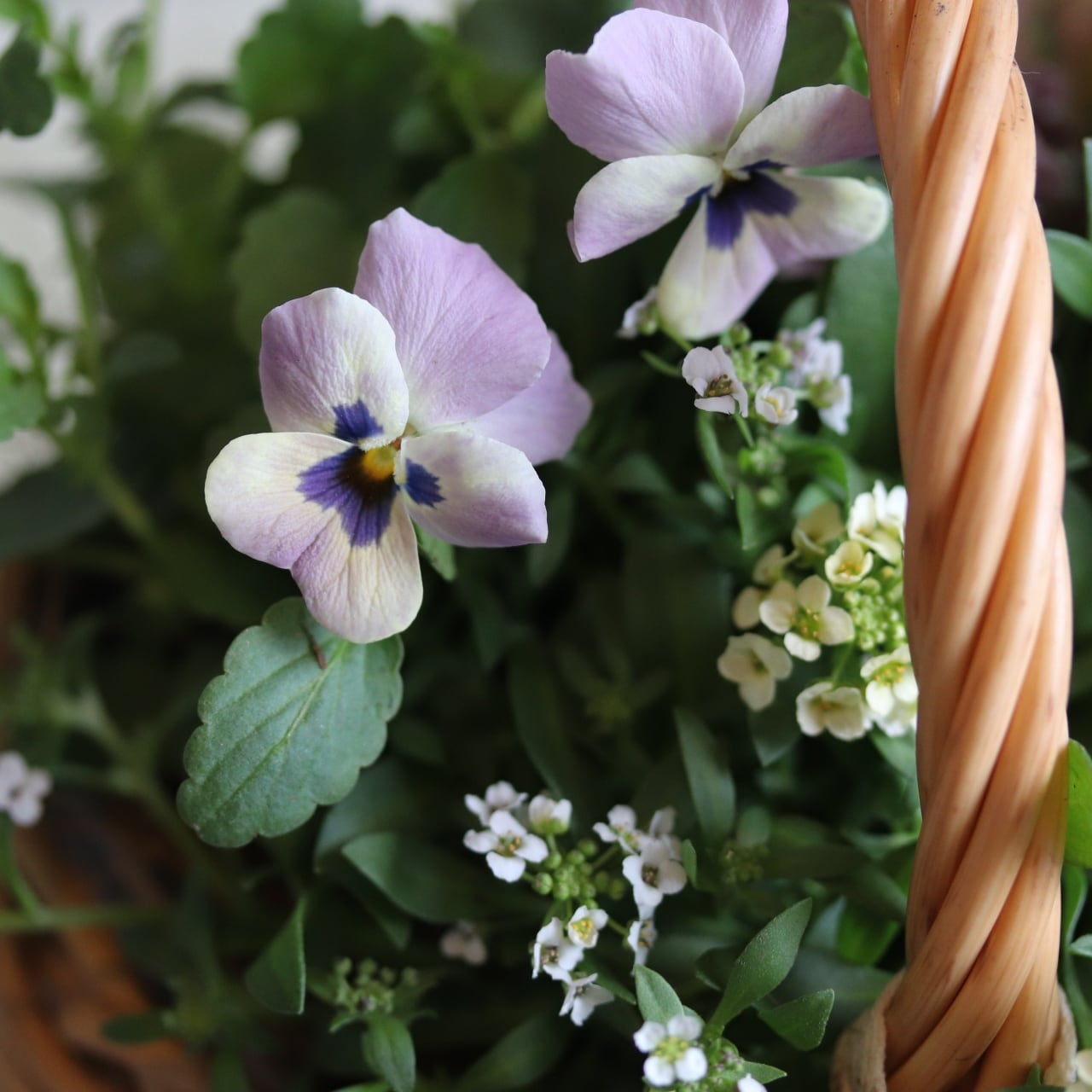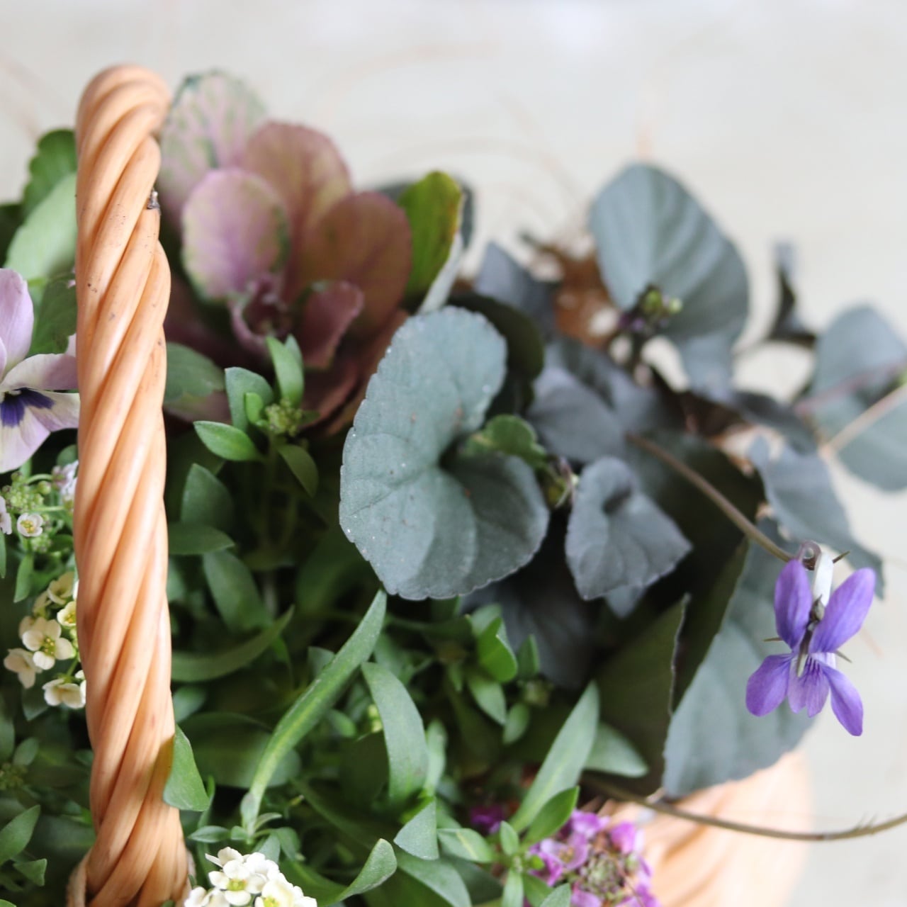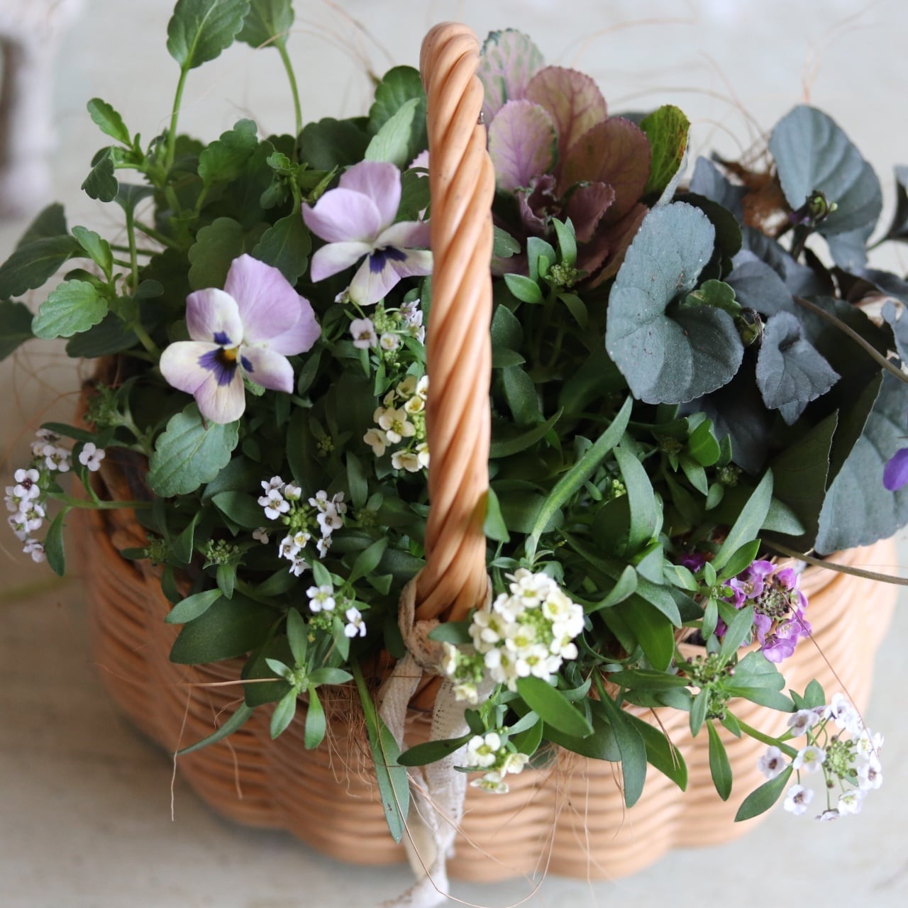 冬から春に楽しむ寄せ植え ビオラトルニーとシックカラーのハボタンのバスケットの寄せ植え お正月にオススメ 届いてすぐ玄関に飾れる プレゼントにもオススメ