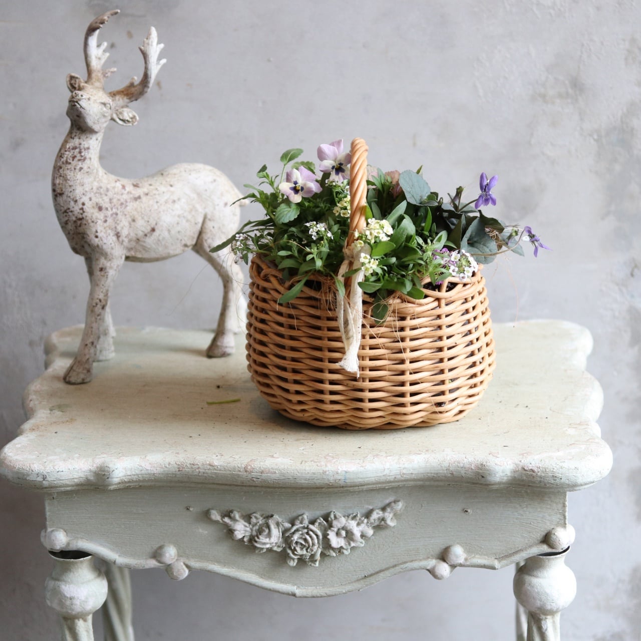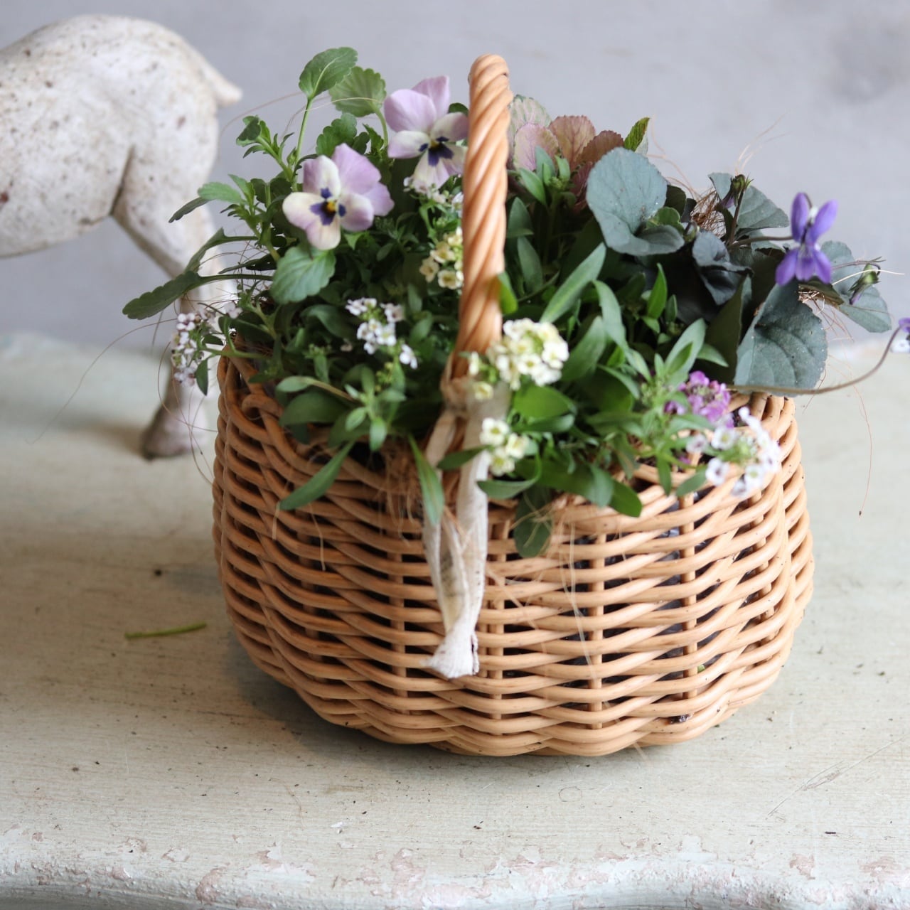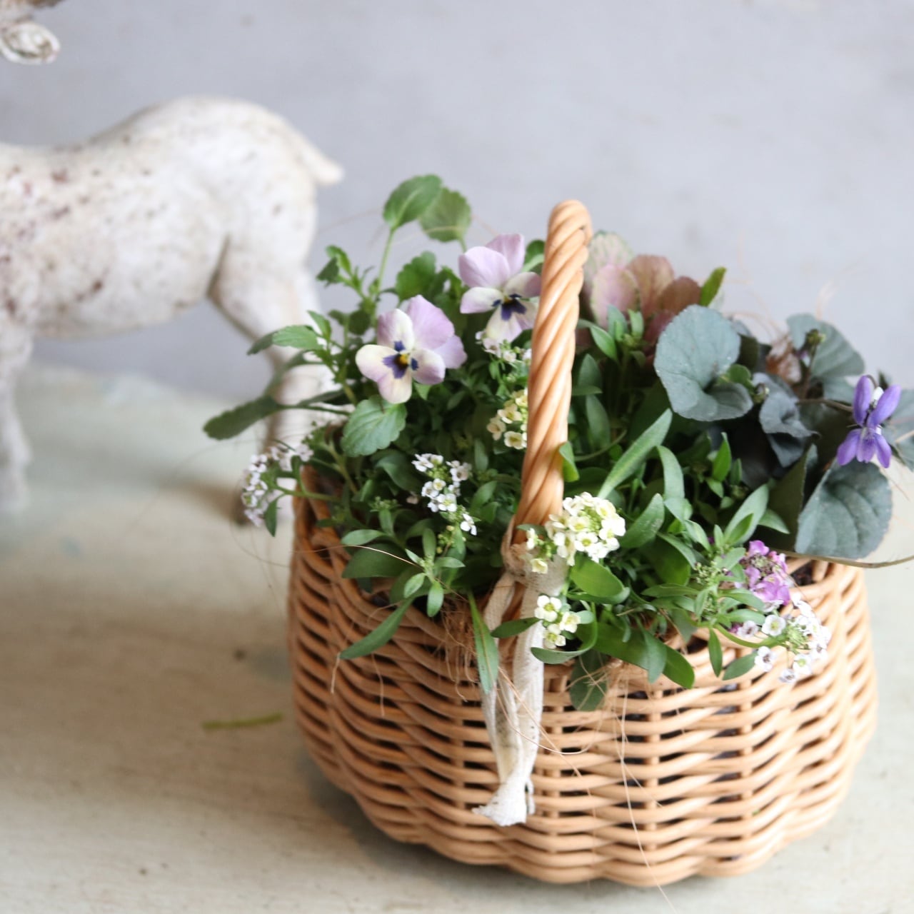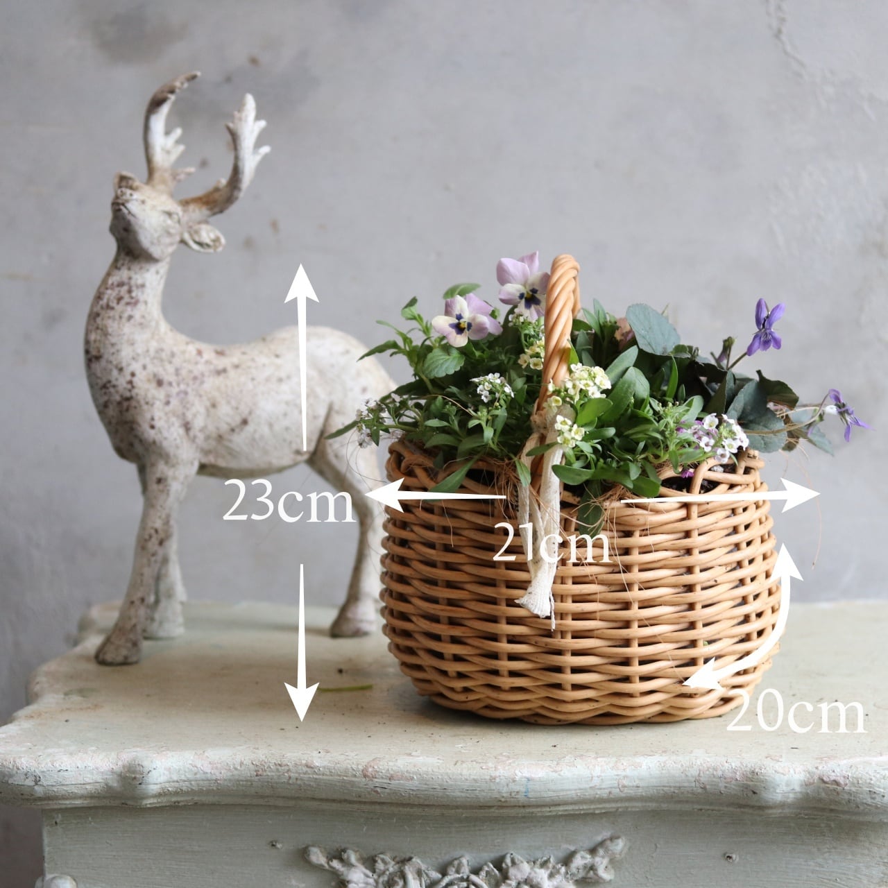 冬から春に楽しむ寄せ植え ビオラトルニーとシックカラーのハボタンのバスケットの寄せ植え お正月にオススメ 届いてすぐ玄関に飾れる プレゼントにもオススメ