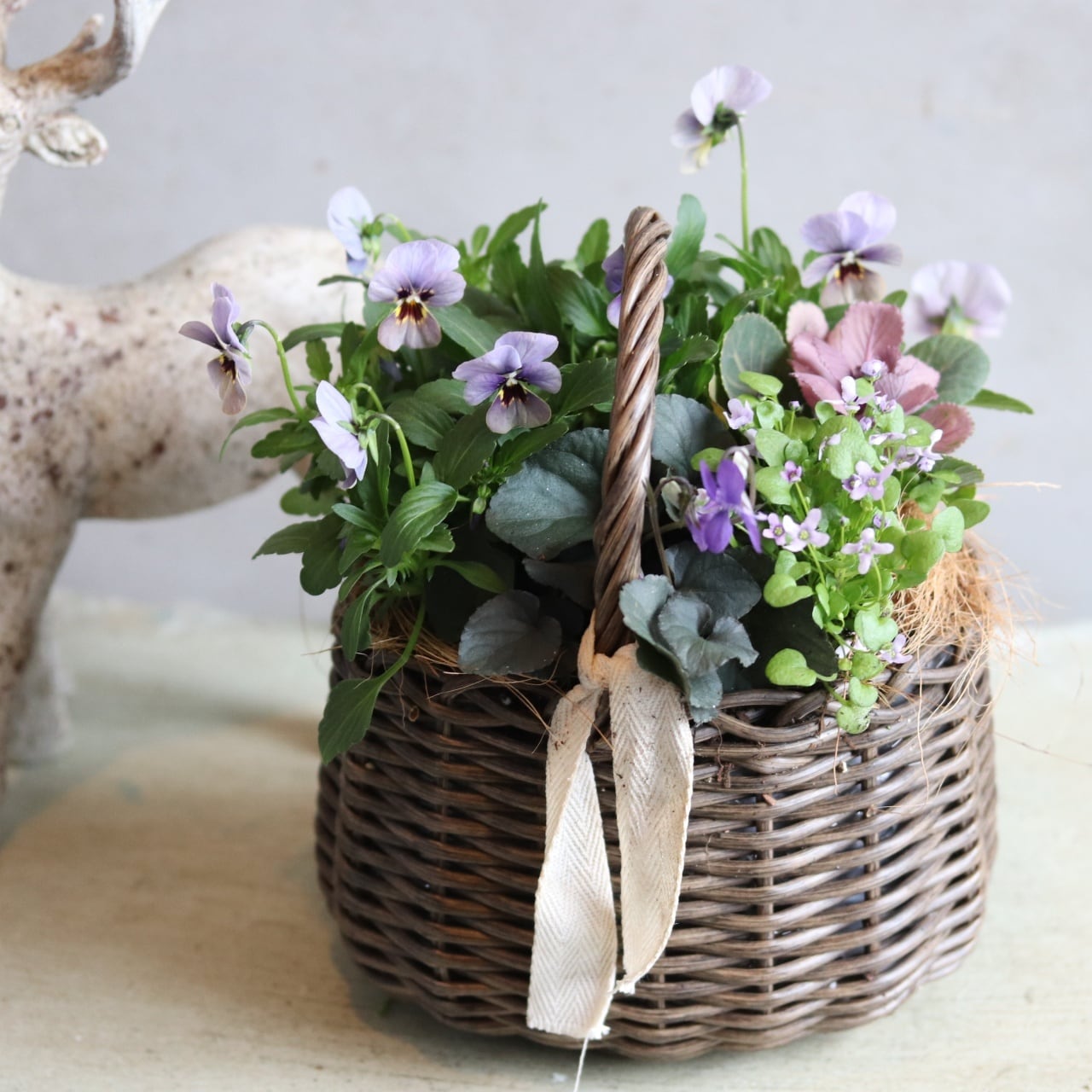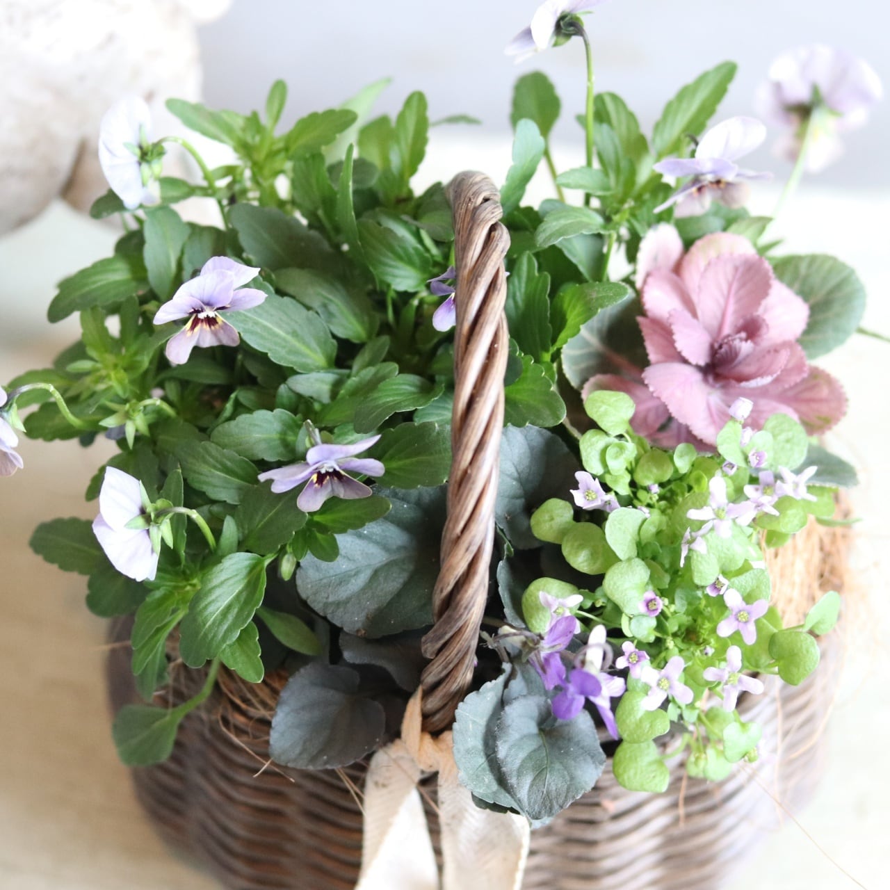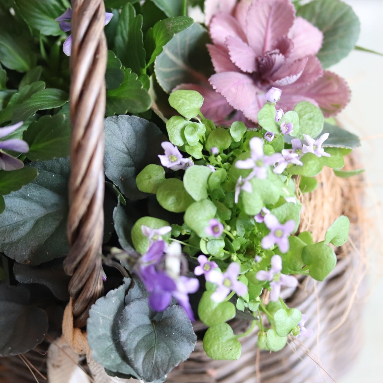 冬から春に楽しむ寄せ植え ビオラNorthIslandViora北島園芸オリジナルとシックカラーのハボタンのバスケットの寄せ植え お正月にオススメ 届いてすぐ玄関に飾れる プレゼントにもオススメ