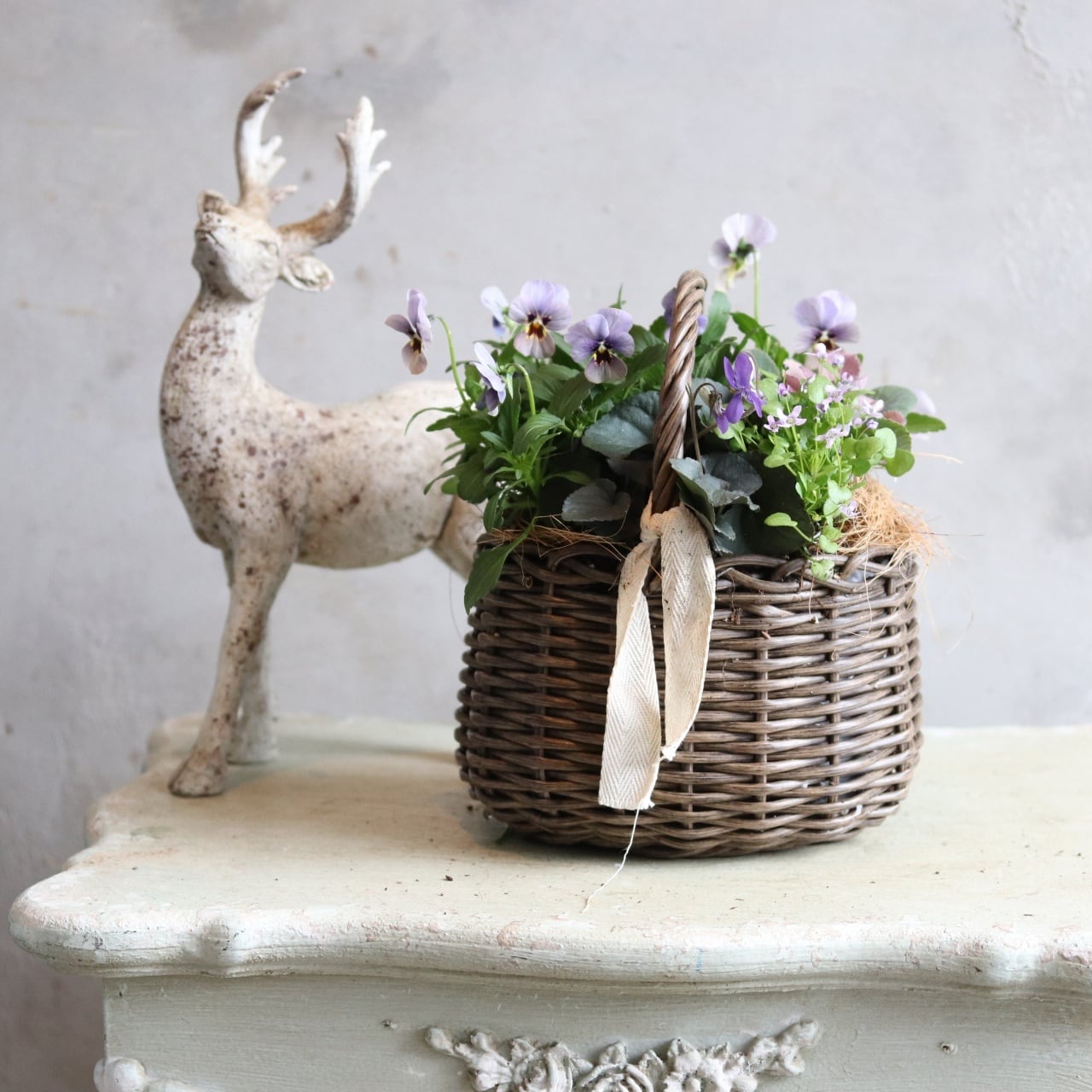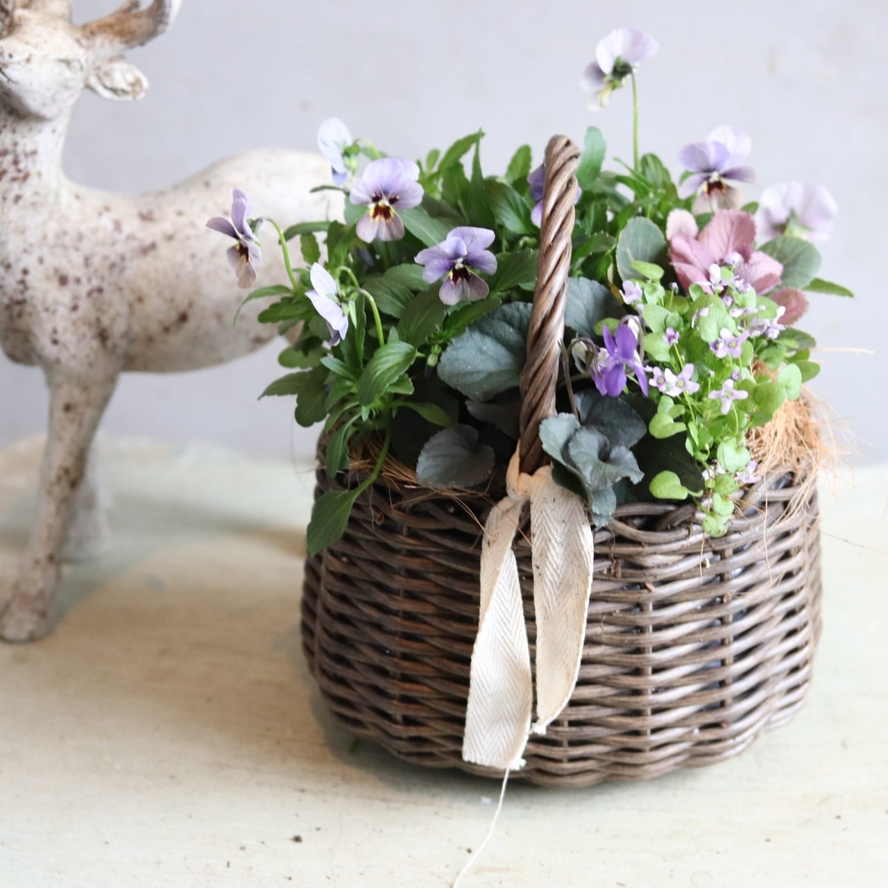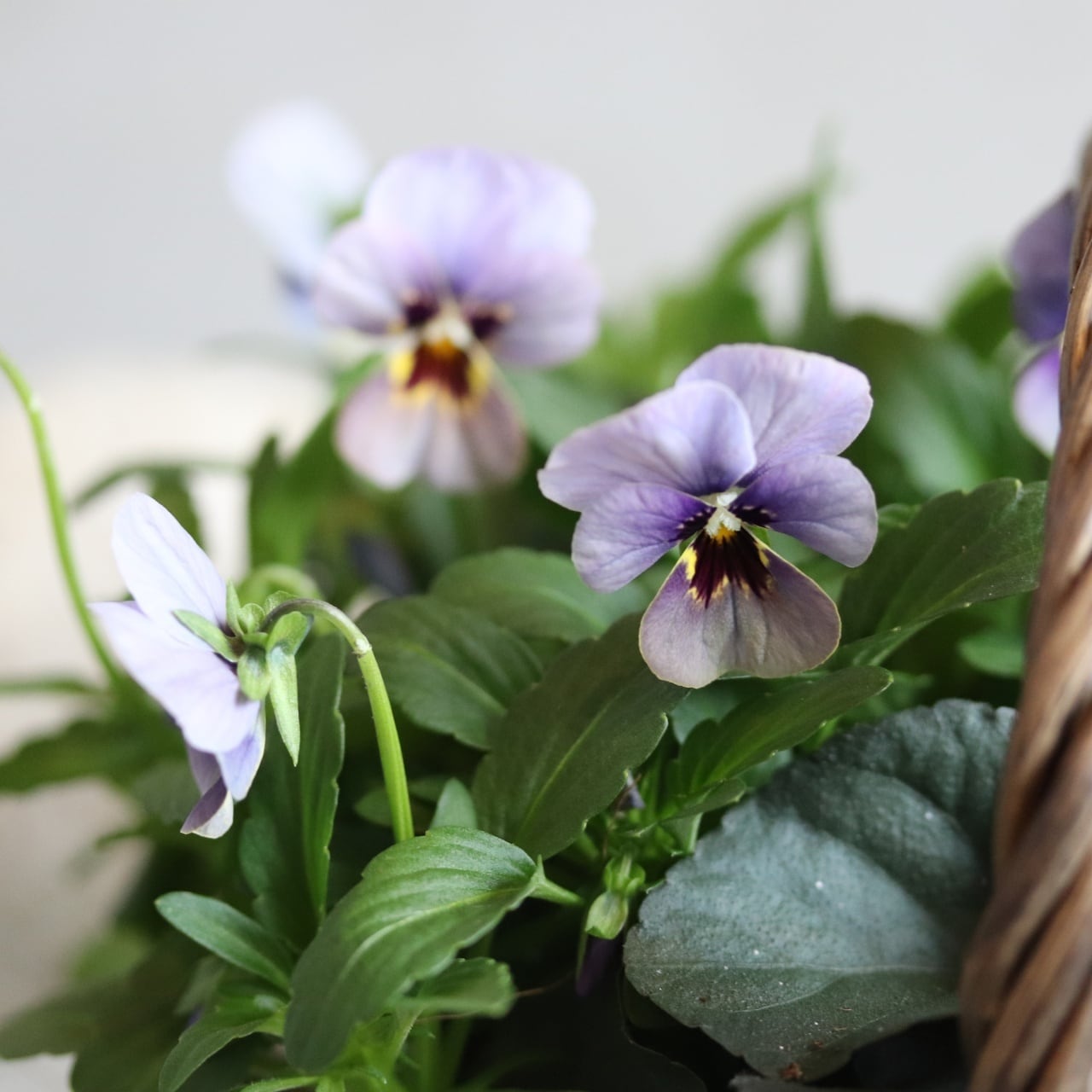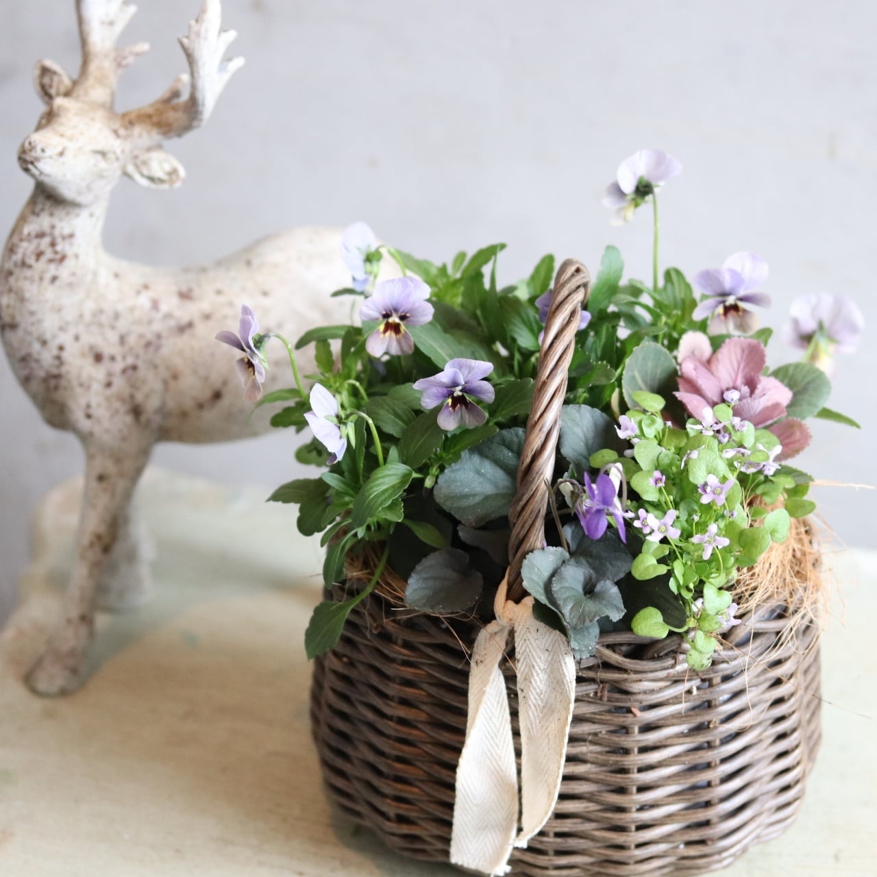 冬から春に楽しむ寄せ植え ビオラNorthIslandViora北島園芸オリジナルとシックカラーのハボタンのバスケットの寄せ植え お正月にオススメ 届いてすぐ玄関に飾れる プレゼントにもオススメ