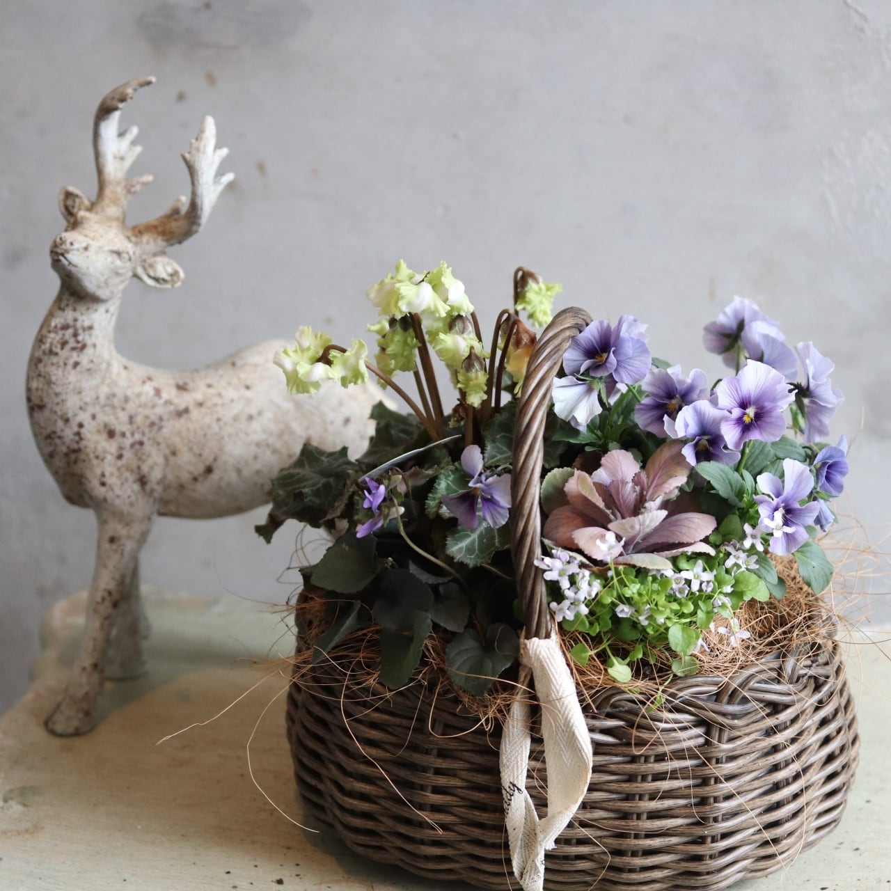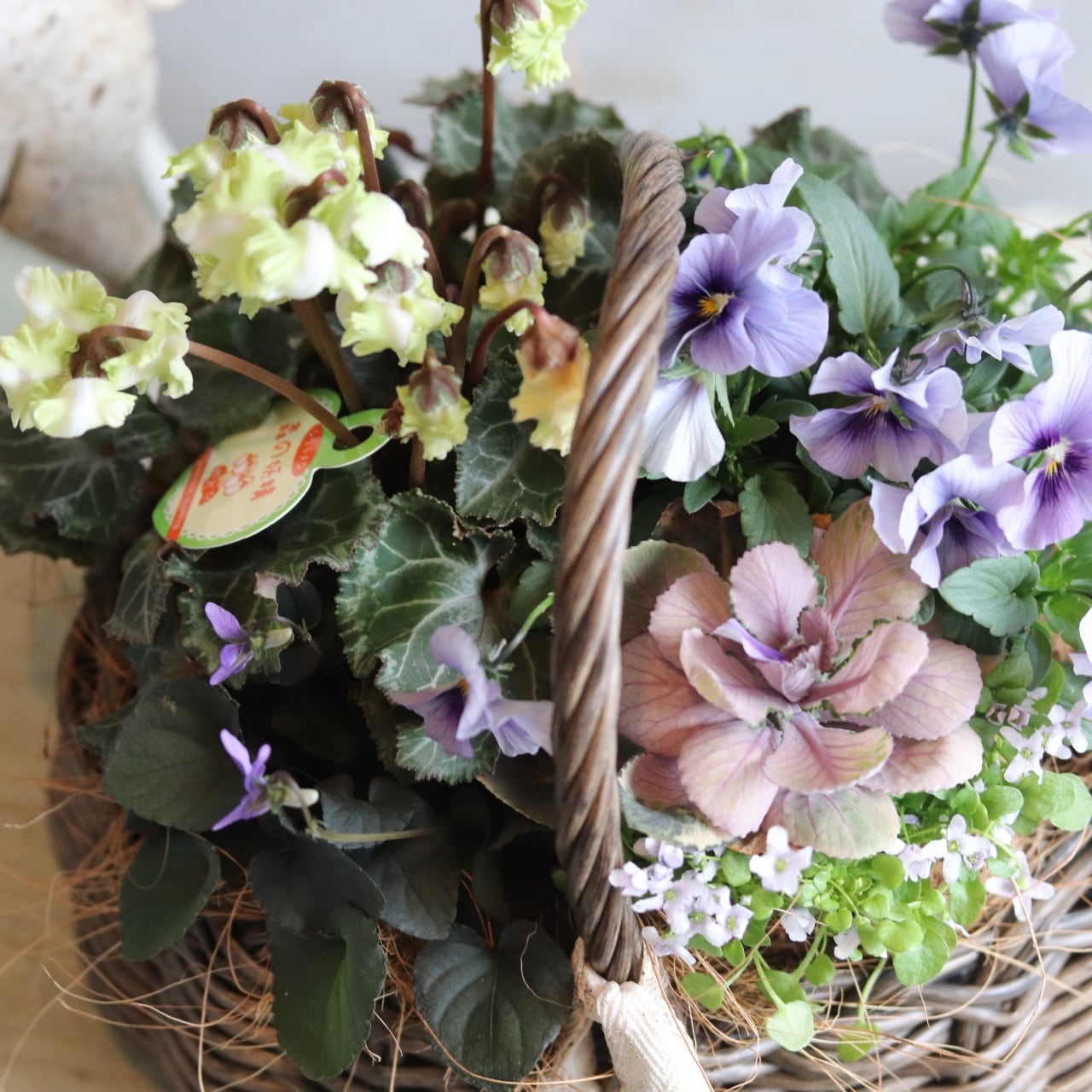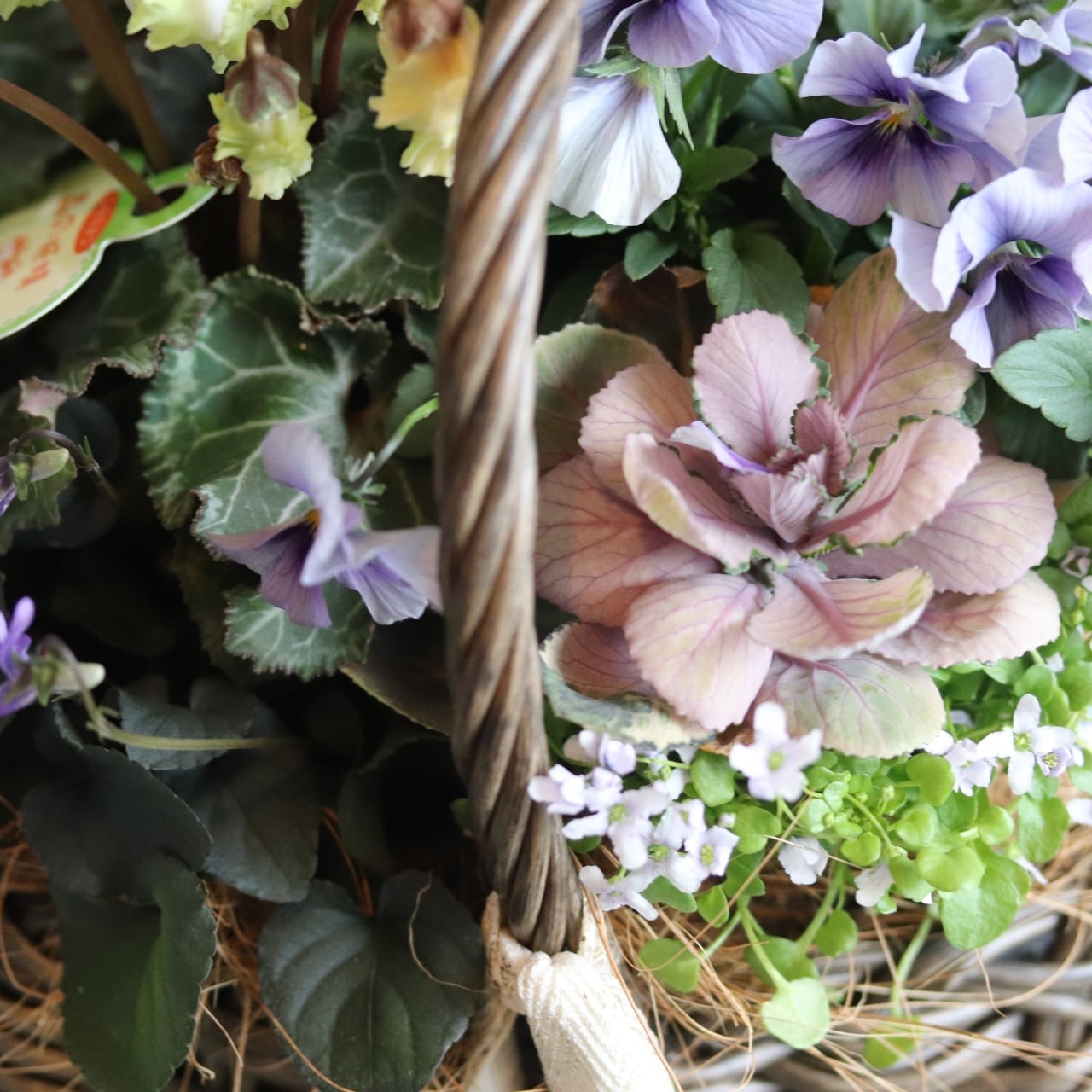 冬から春に楽しむ寄せ植え シクラメン森の妖精とNorthIslandビオラのシャビームラサキカラーのハボタンのバスケットの寄せ植え お正月にオススメ 届いてすぐ玄関に飾れる プレゼントにもオススメ