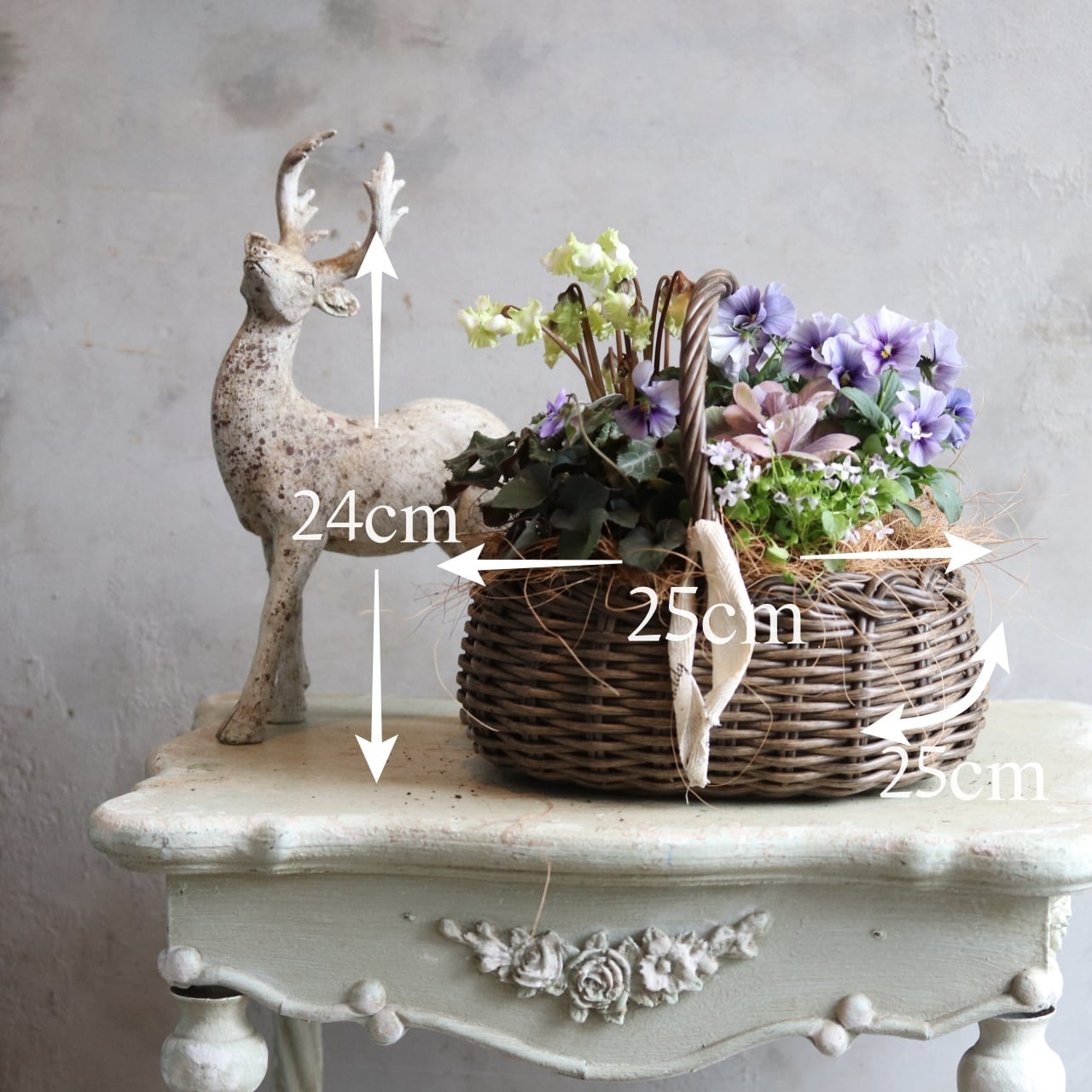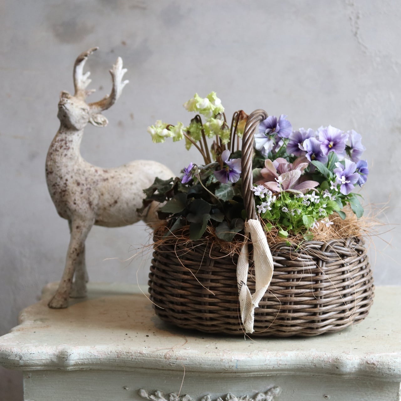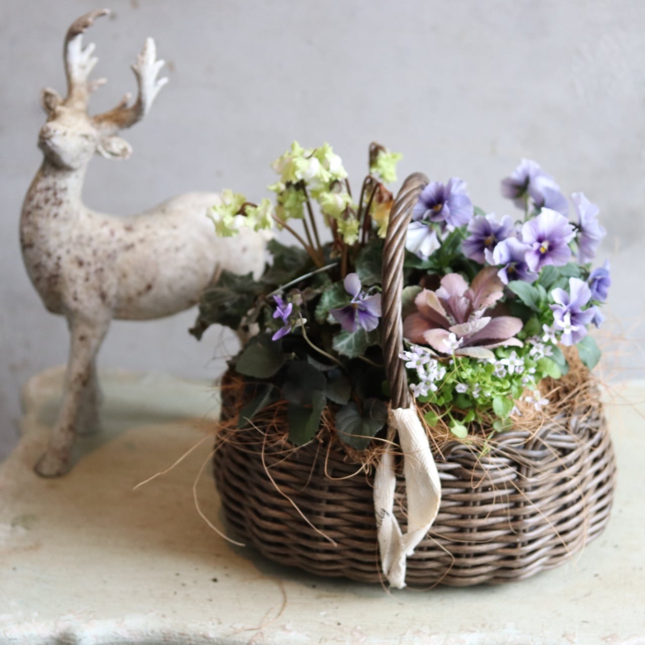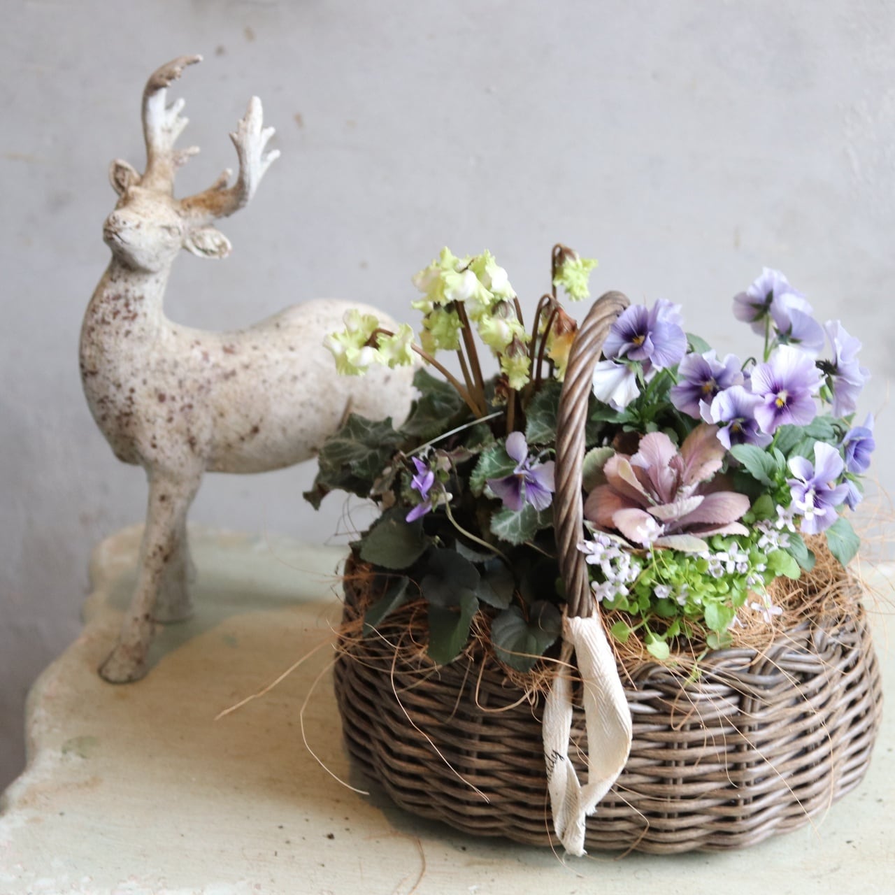 冬から春に楽しむ寄せ植え シクラメン森の妖精とNorthIslandビオラのシャビームラサキカラーのハボタンのバスケットの寄せ植え お正月にオススメ 届いてすぐ玄関に飾れる プレゼントにもオススメ