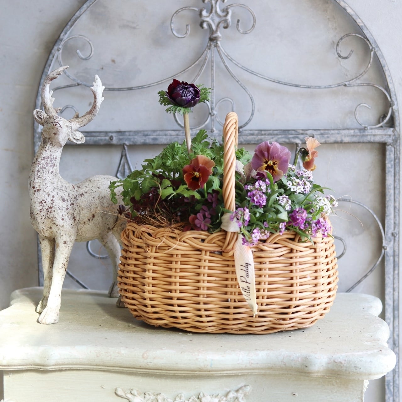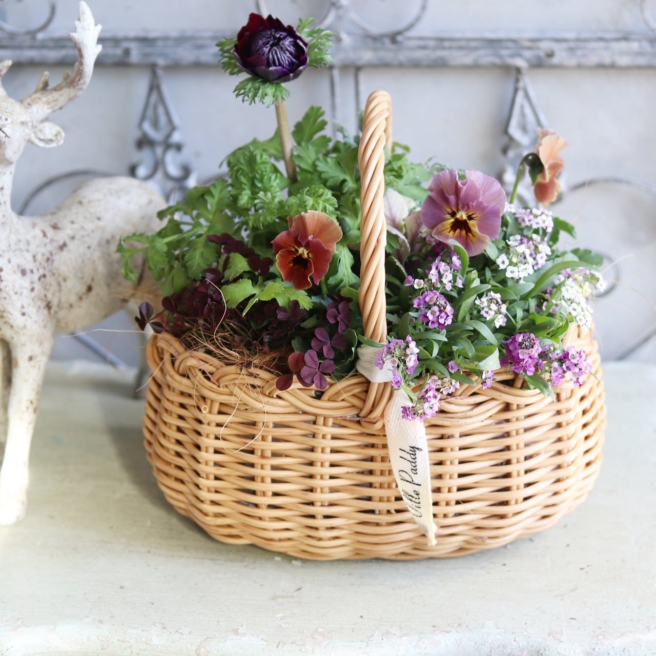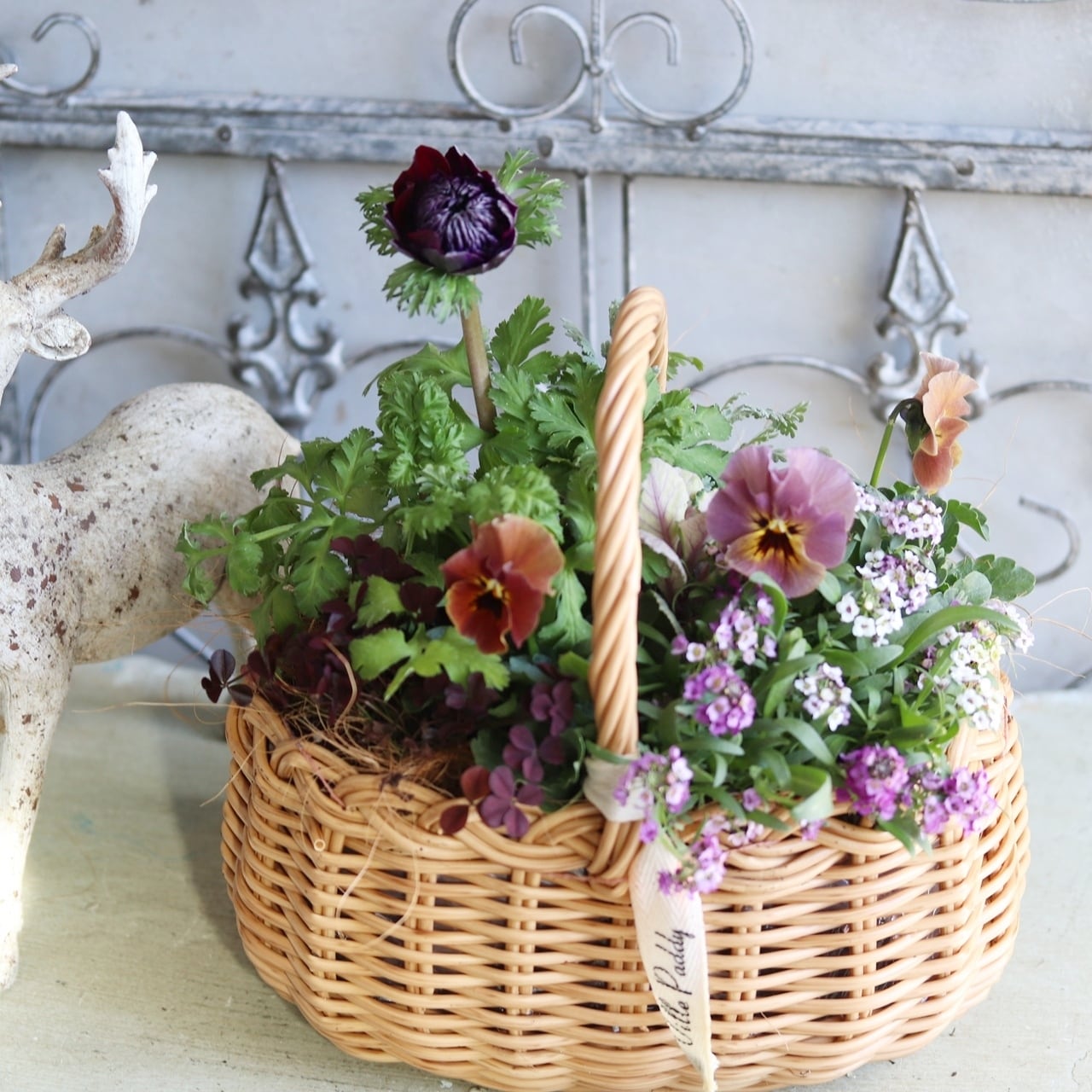冬から春に楽しむ寄せ植え アネモネファネモスとシックなビオラマルンマルンのバスケットの寄せ植え お正月にオススメ 届いてすぐ玄関に飾れる プレゼントにもオススメ