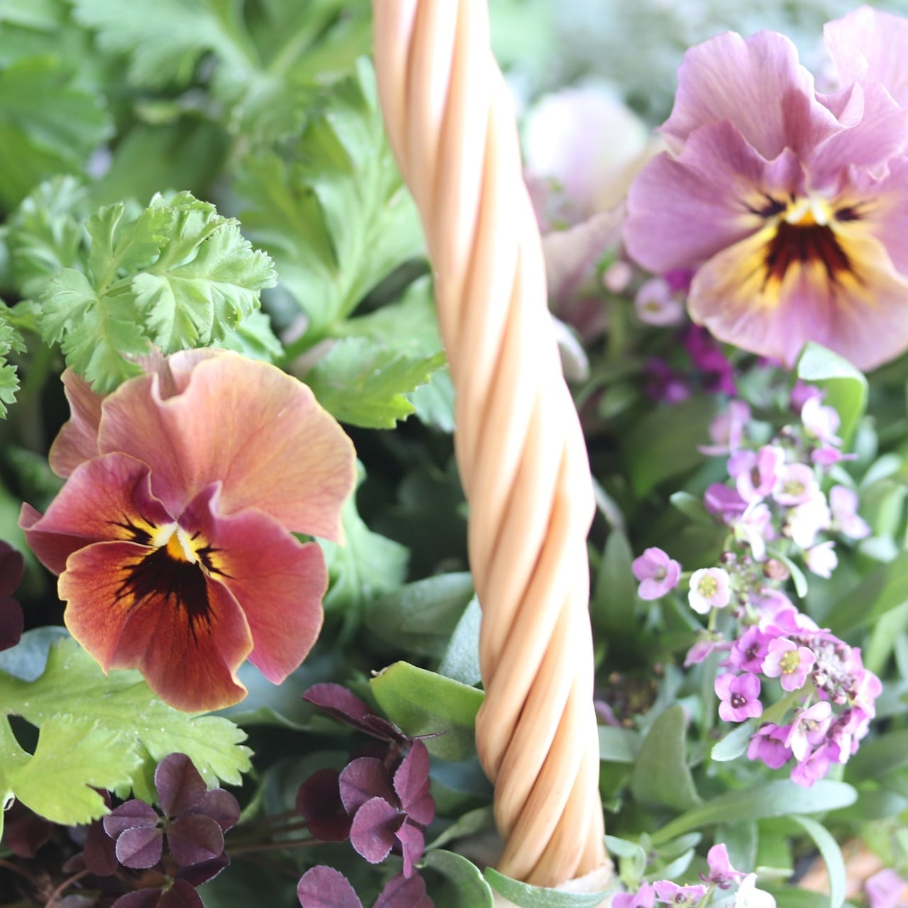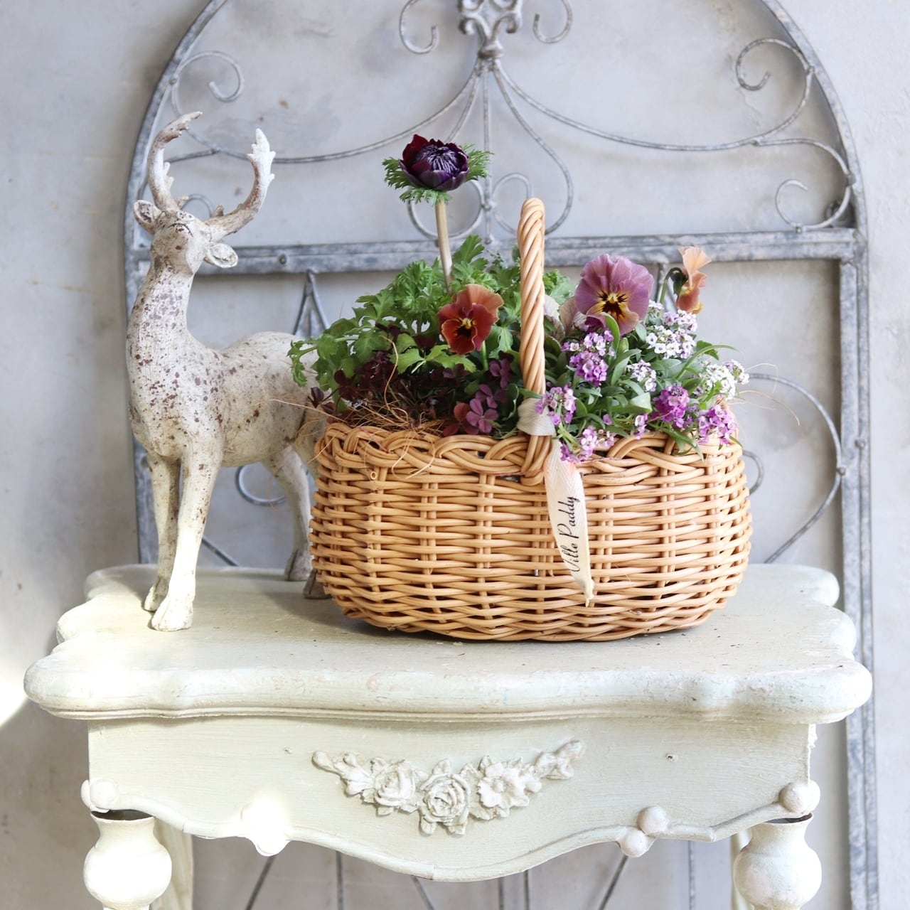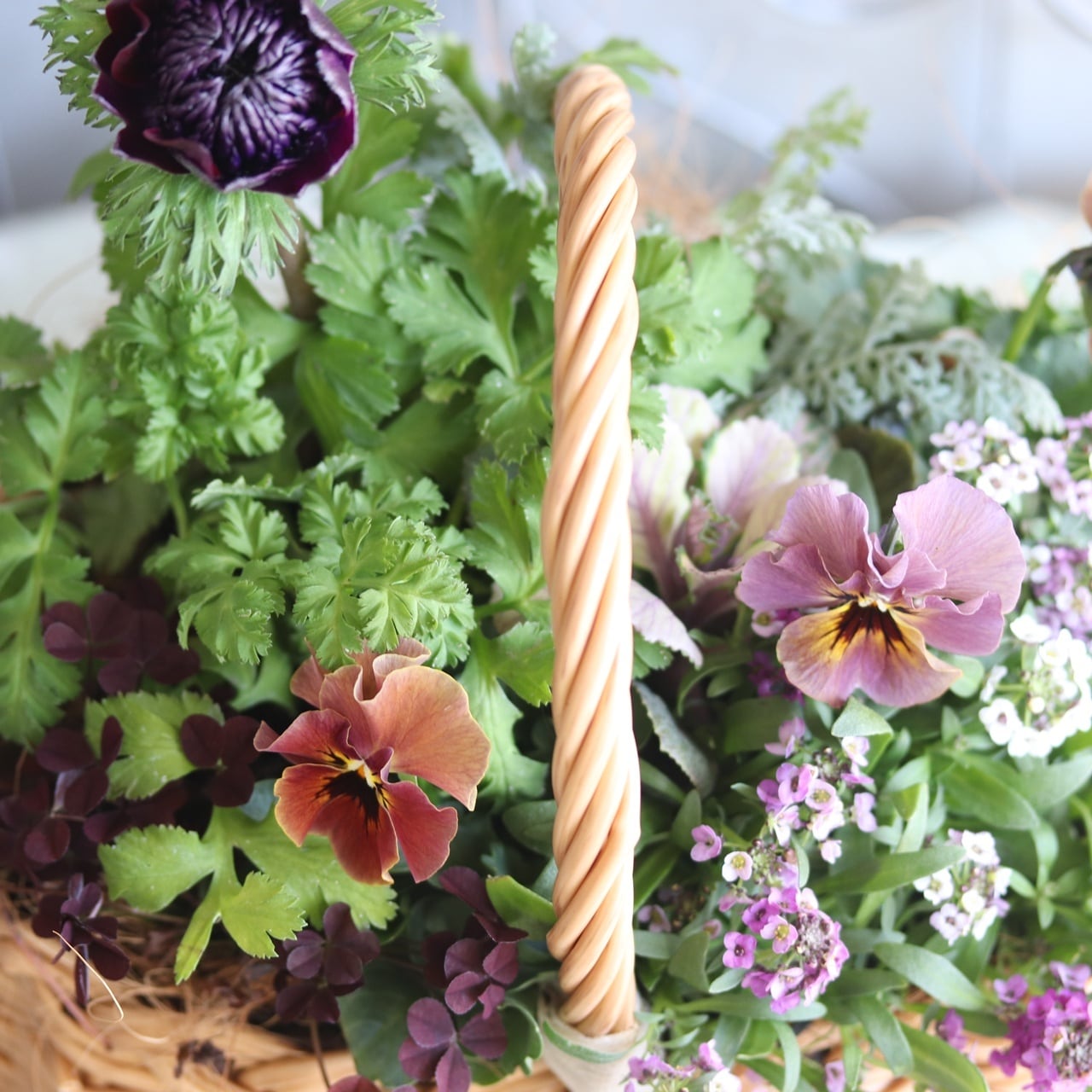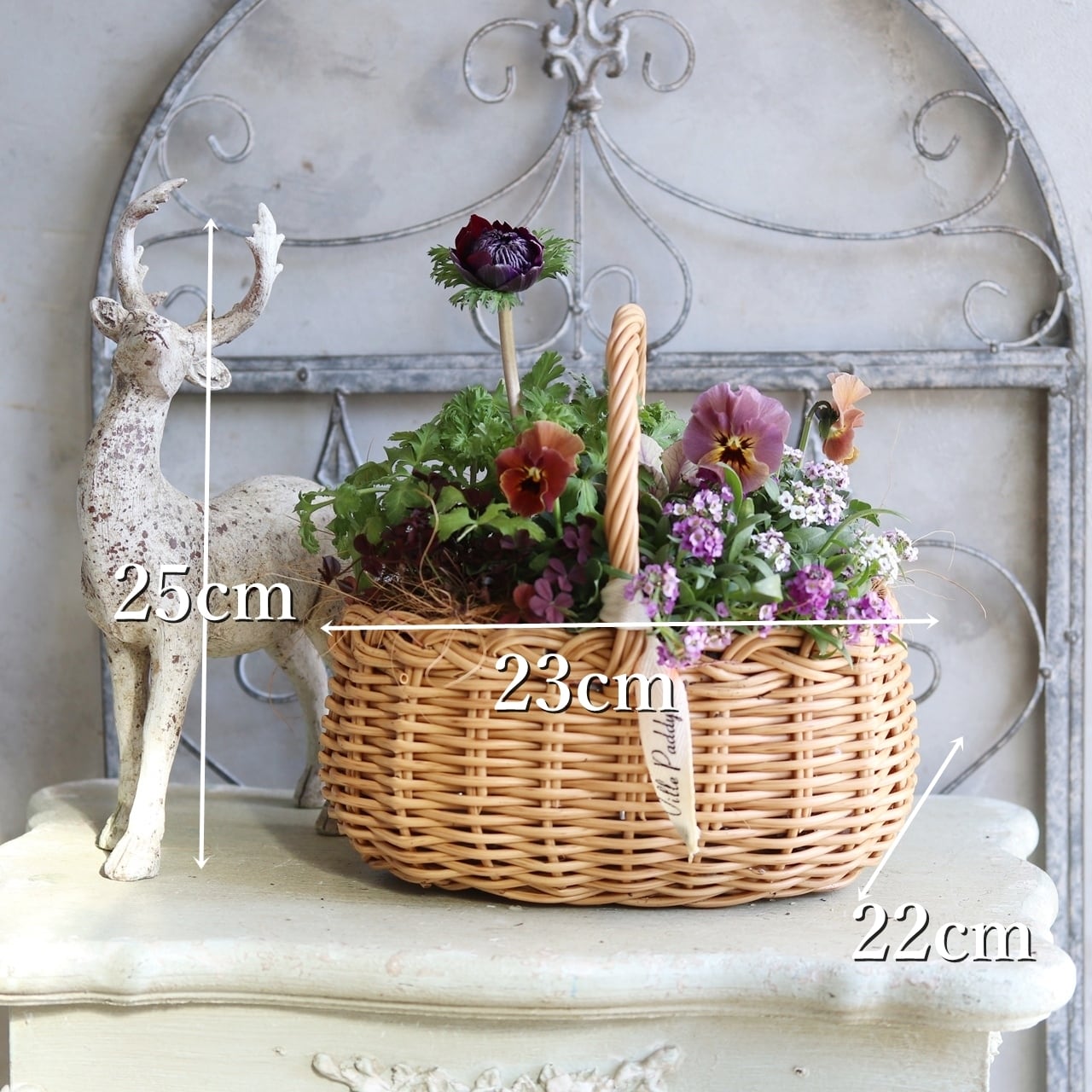 冬から春に楽しむ寄せ植え アネモネファネモスとシックなビオラマルンマルンのバスケットの寄せ植え お正月にオススメ 届いてすぐ玄関に飾れる プレゼントにもオススメ