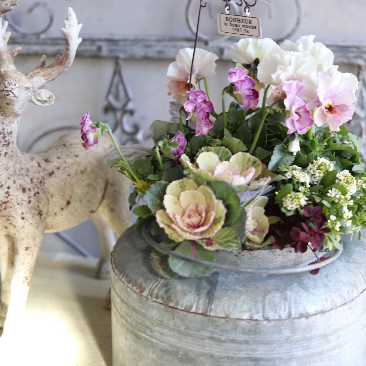 冬から春に楽しむ寄せ植え ミルク缶でハボタンあかねのお正月におすすめの寄せ植え ピック付き お正月にオススメ 届いてすぐ玄関に飾れる プレゼントにもオススメ