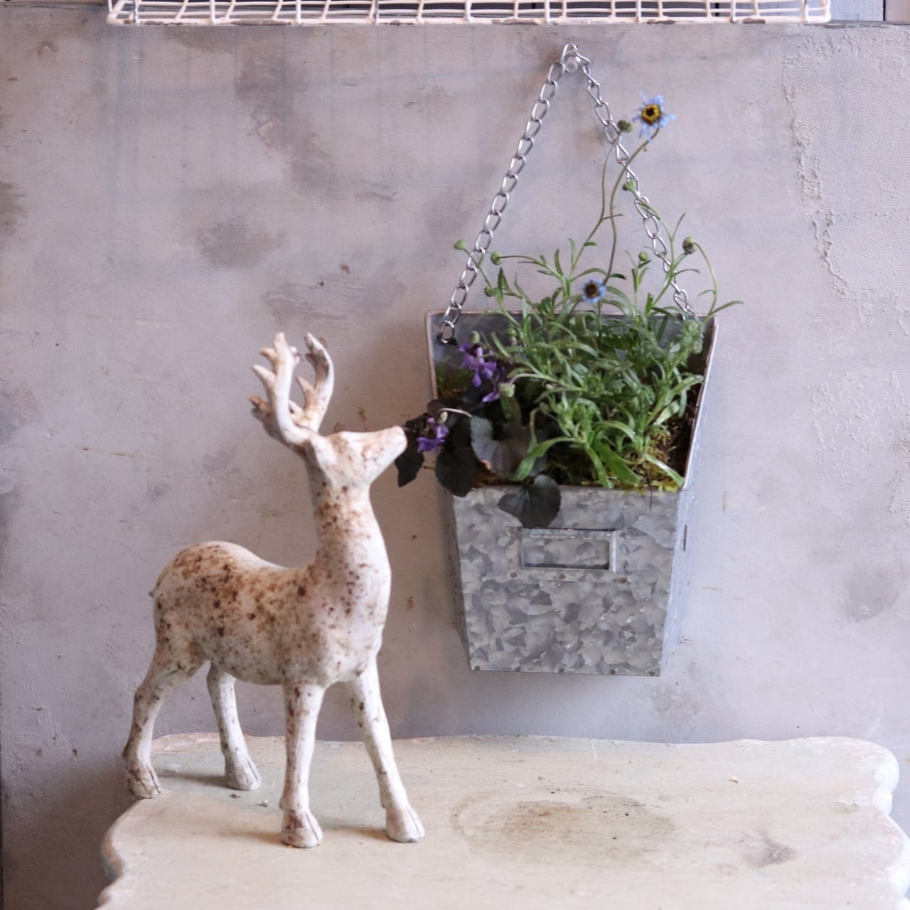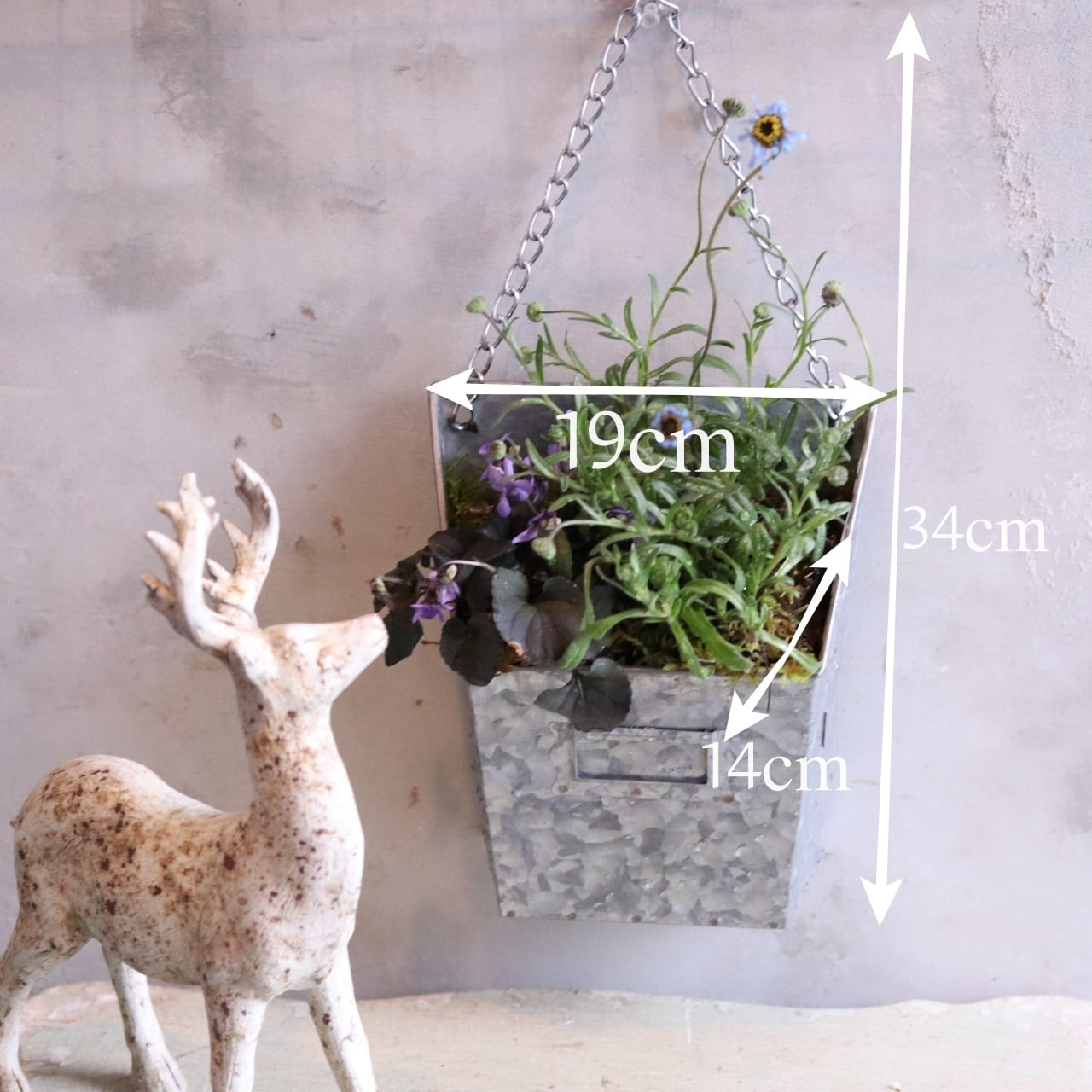 シャビーな壁にもかけれるハンギングのデザインのブリキポットに