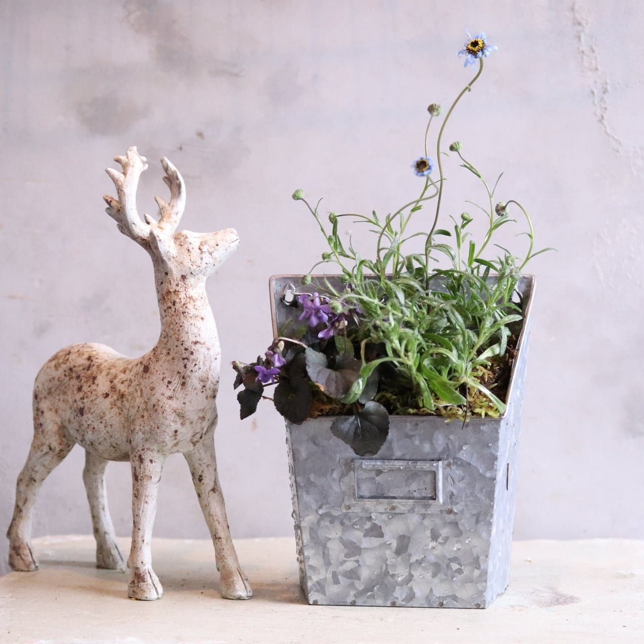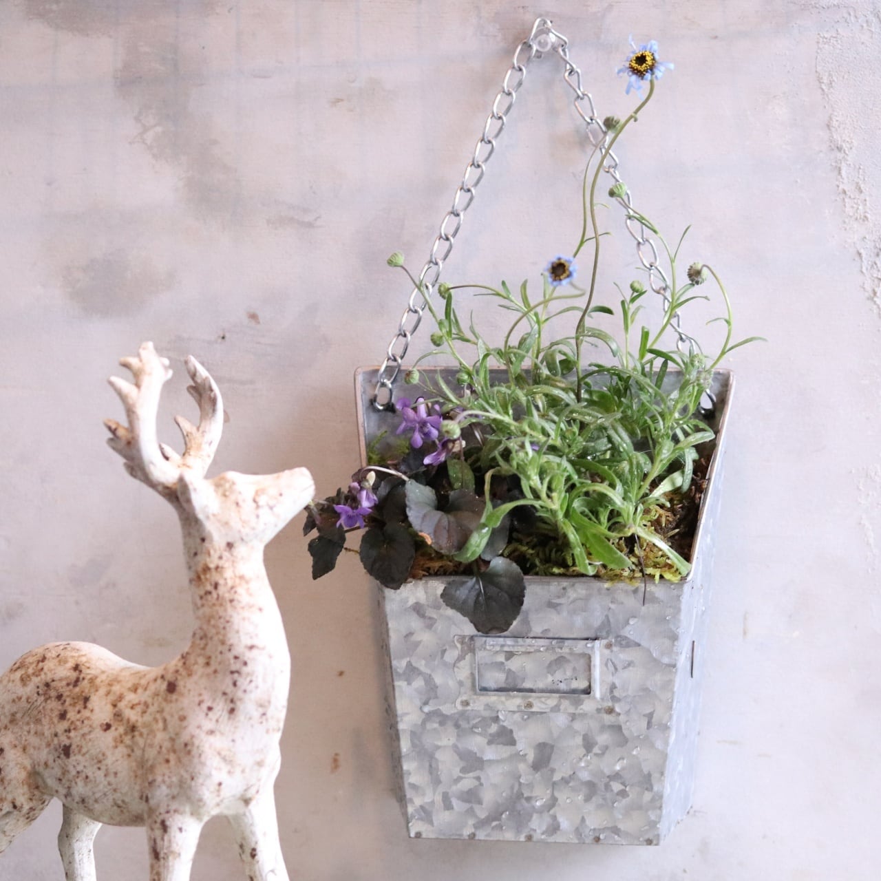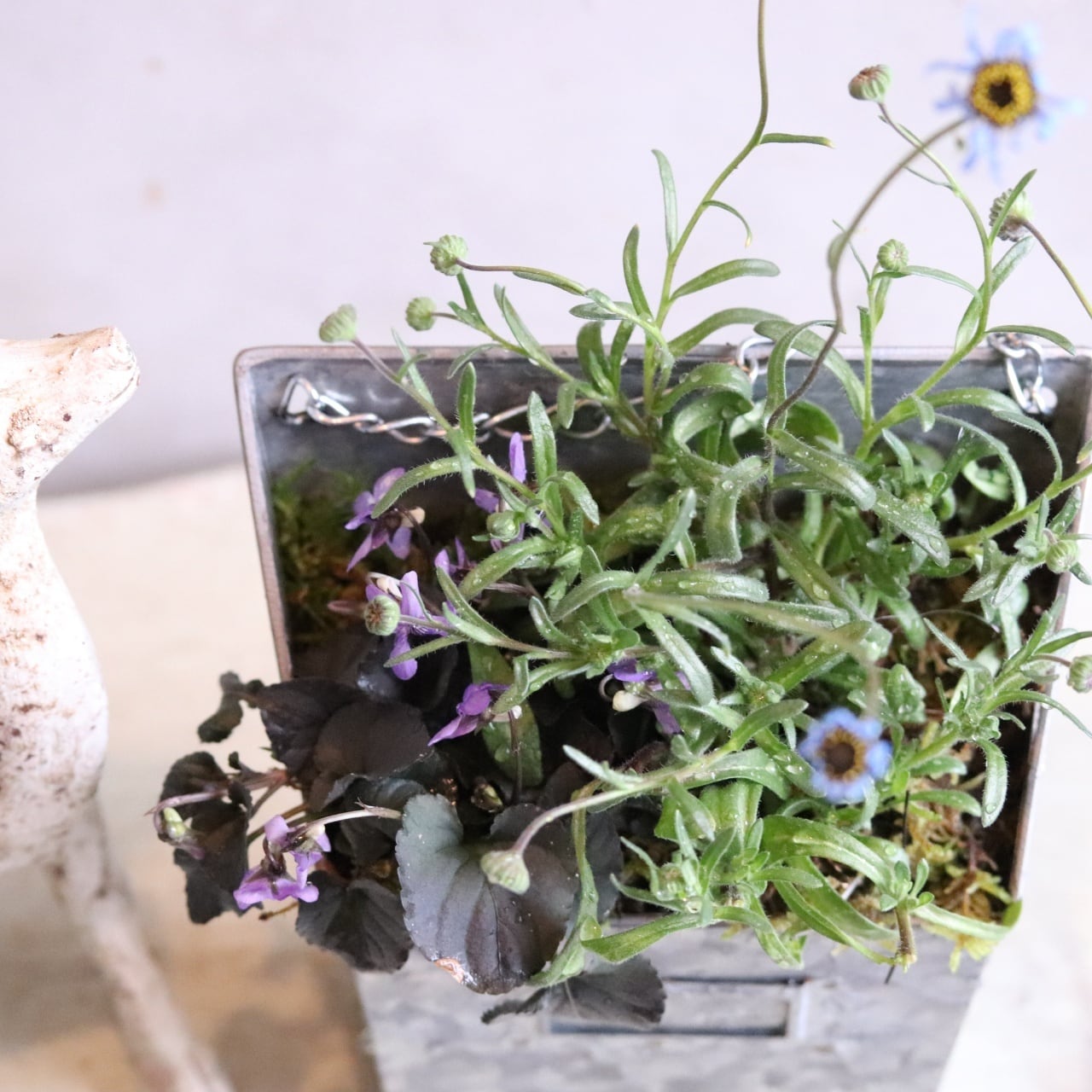 春に楽しむ寄せ植え キングフィッシャーデージーとスミレのハングブリキの寄せ植え 壁にオススメ 届いてすぐ玄関に飾れる プレゼントにもオススメ