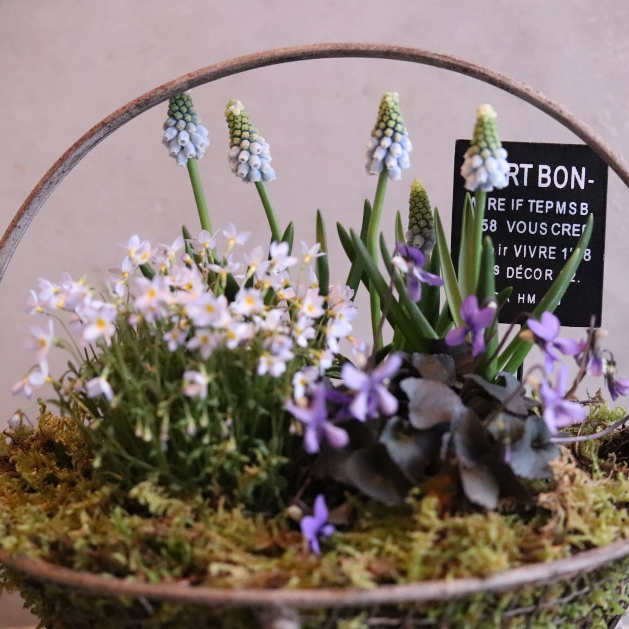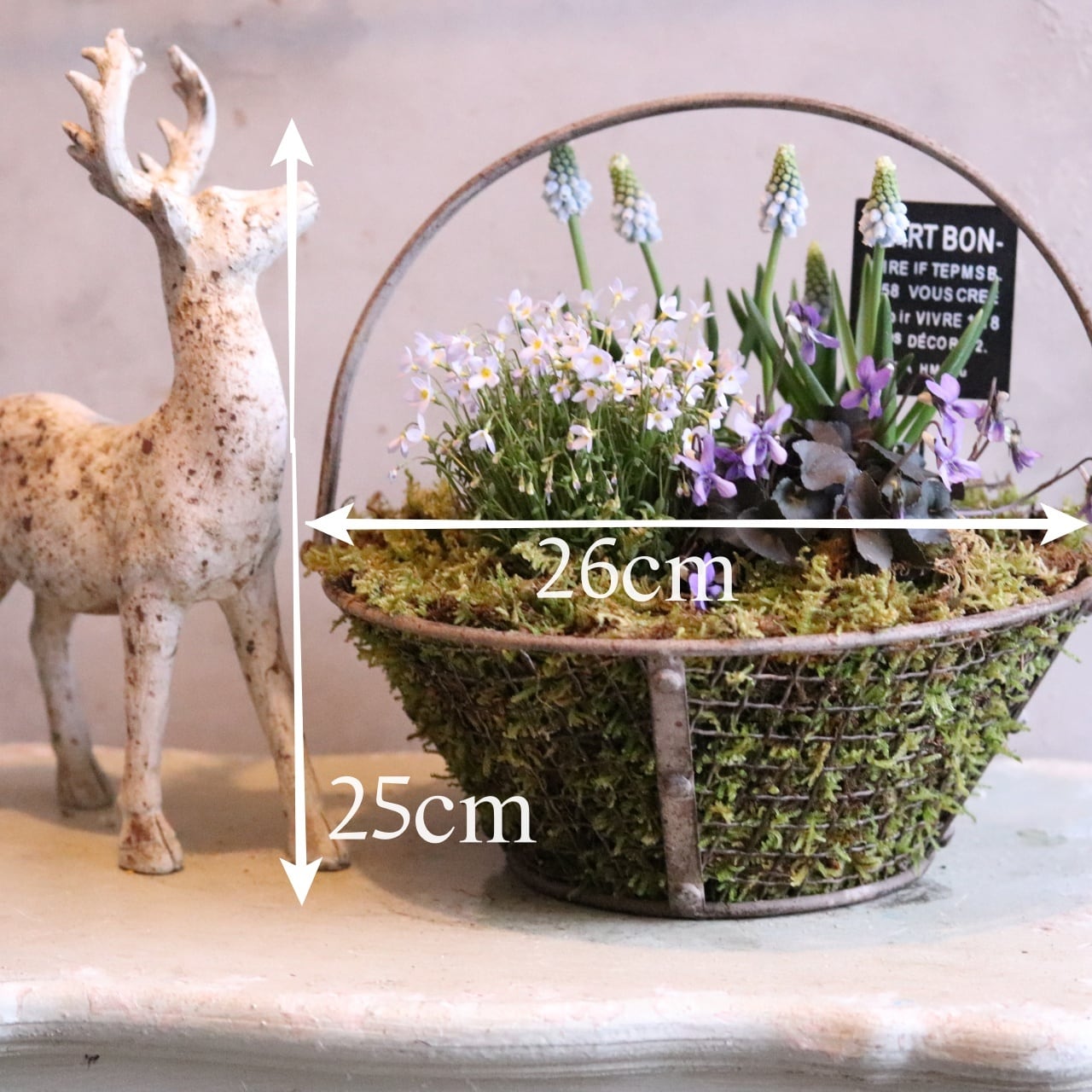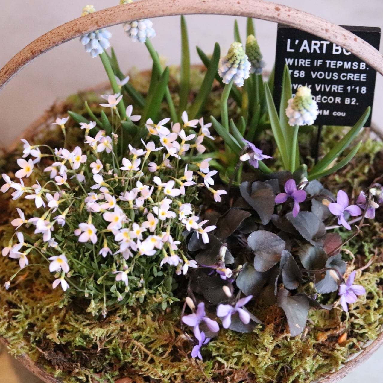 コピー:コケワイヤーバスケットのムスカリと春のお花 ピック付き 寄せ植え 届いてすぐ玄関に飾れる プレゼントにもオススメ
