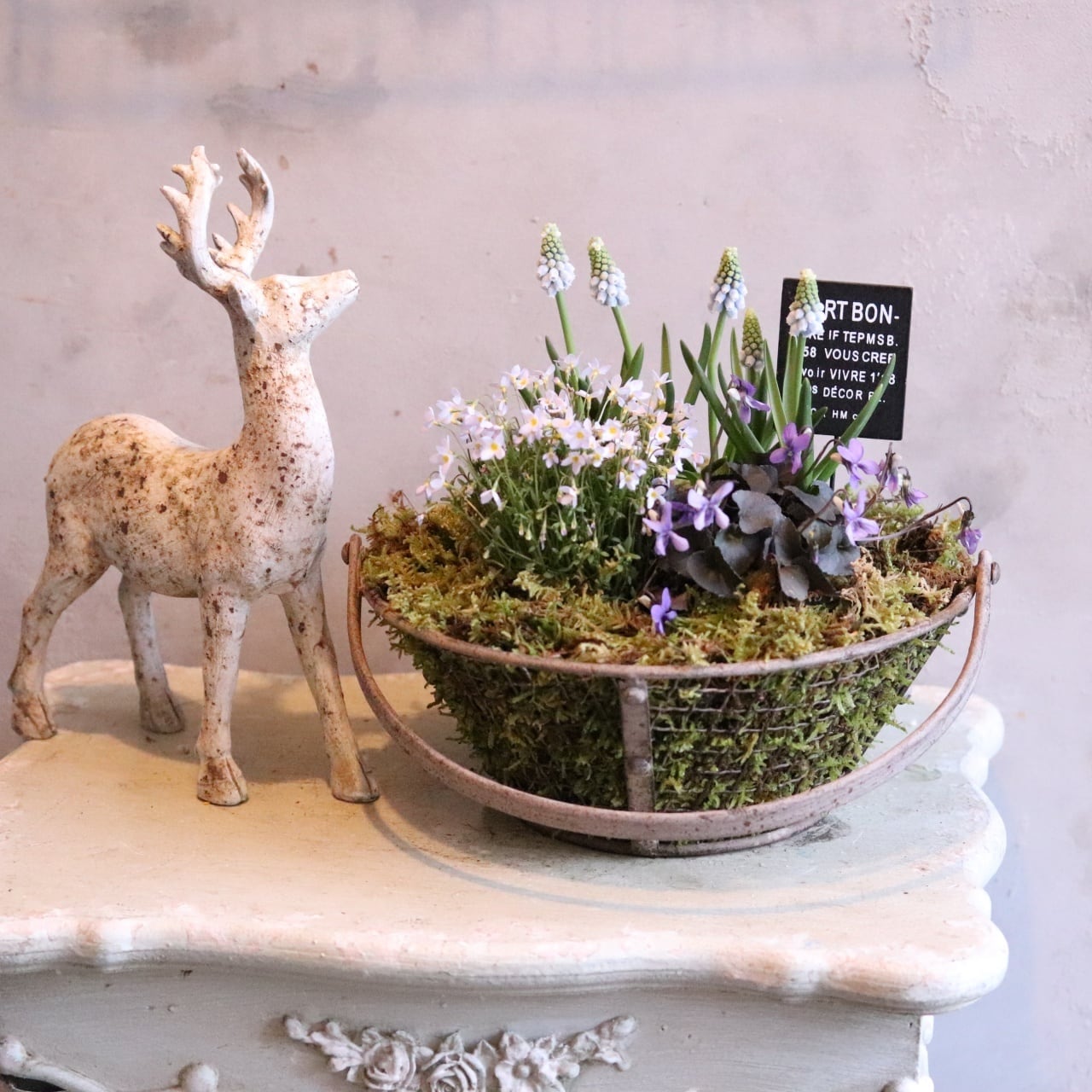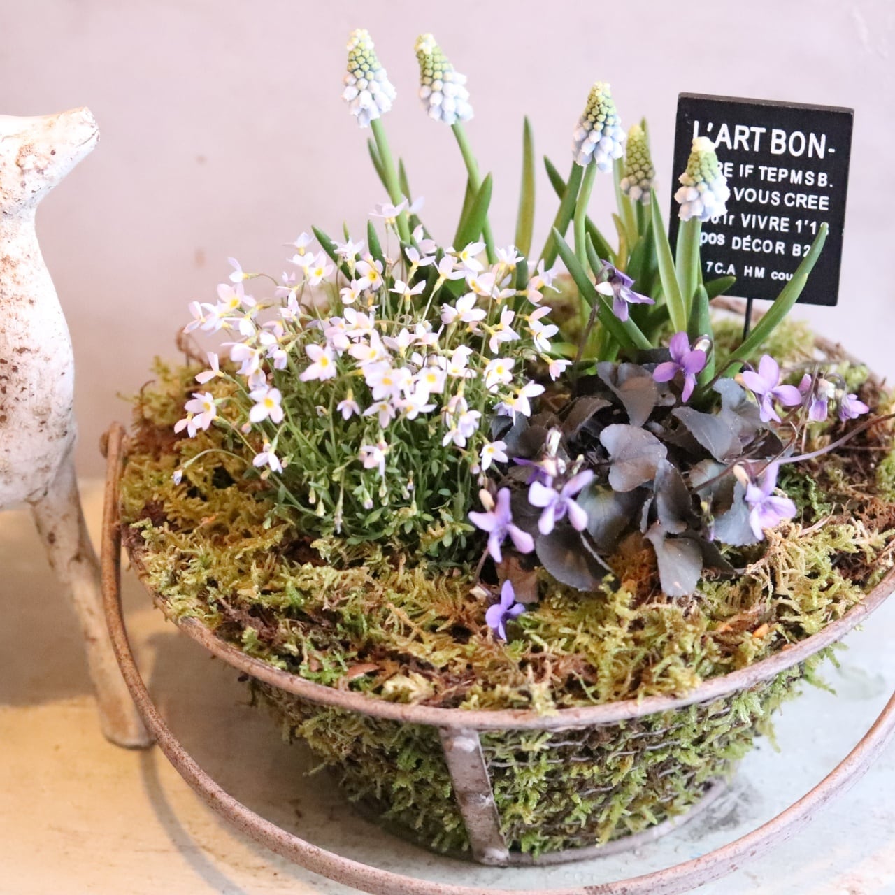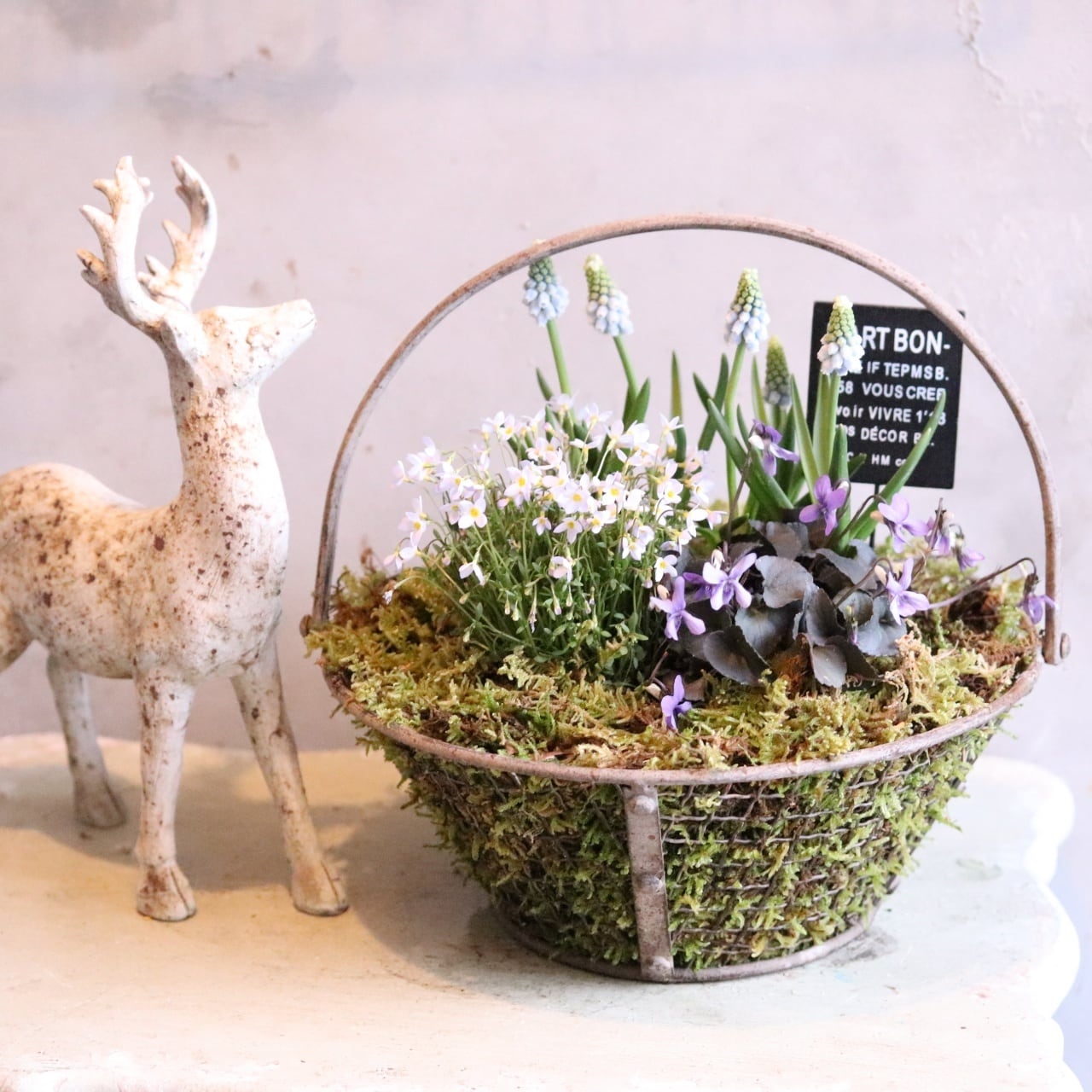 コピー:コケワイヤーバスケットのムスカリと春のお花 ピック付き 寄せ植え 届いてすぐ玄関に飾れる プレゼントにもオススメ