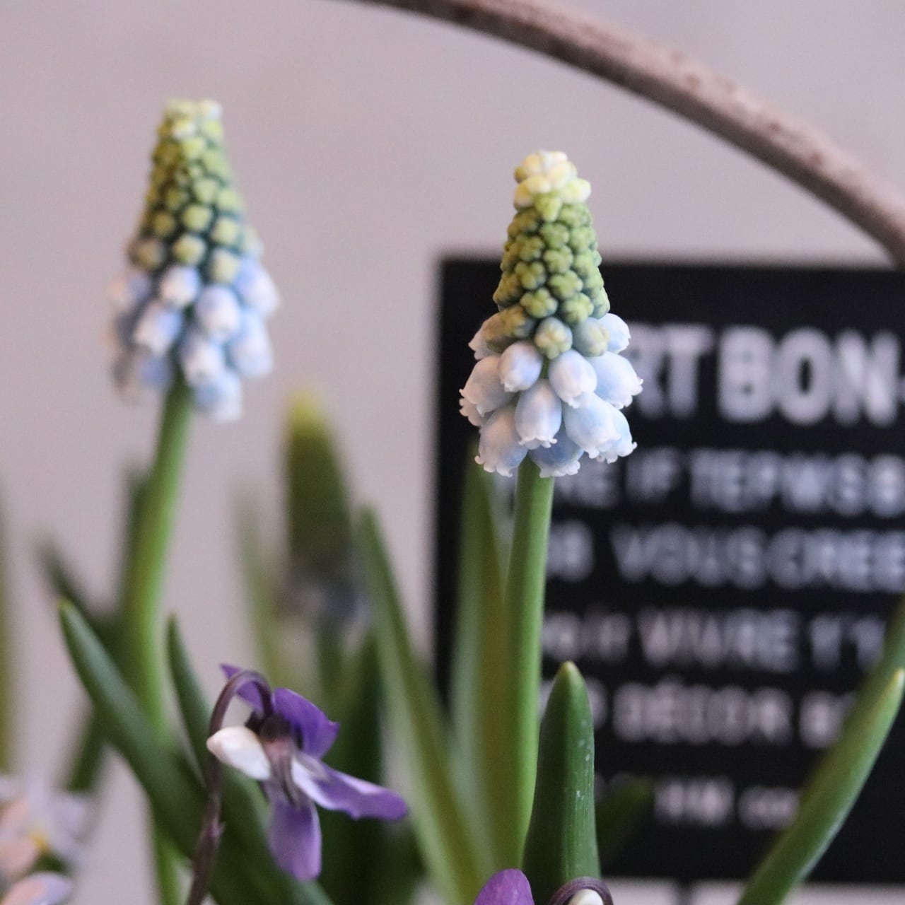 黒葉スミレは多年草で、ムスカリも植えたままで楽しめます