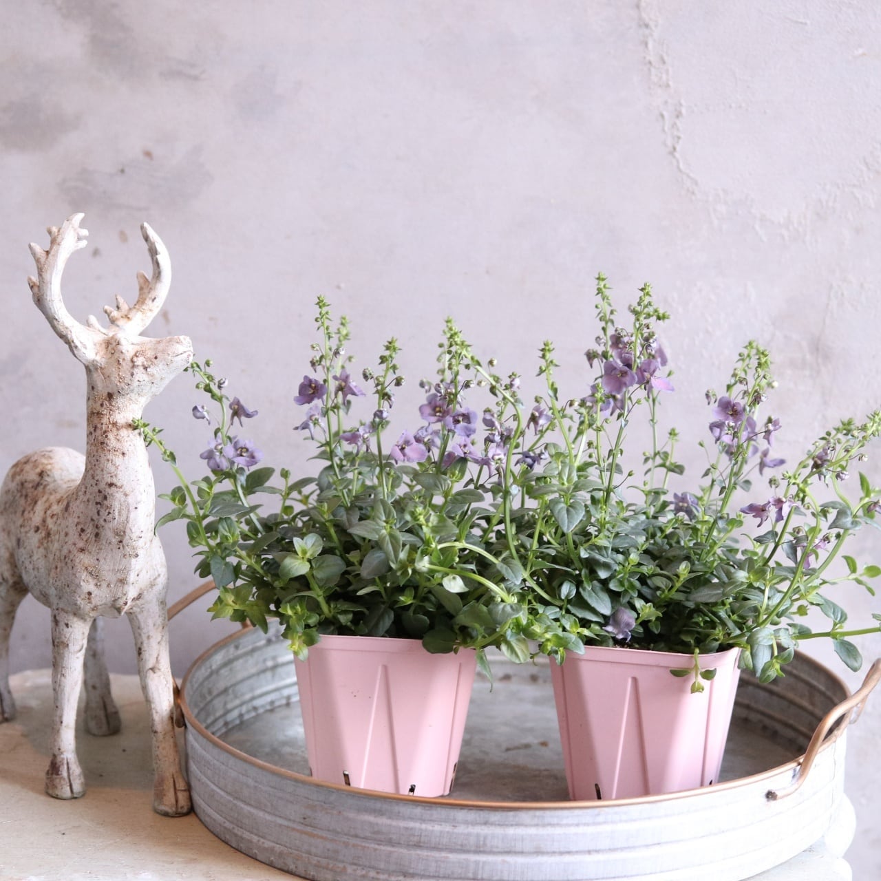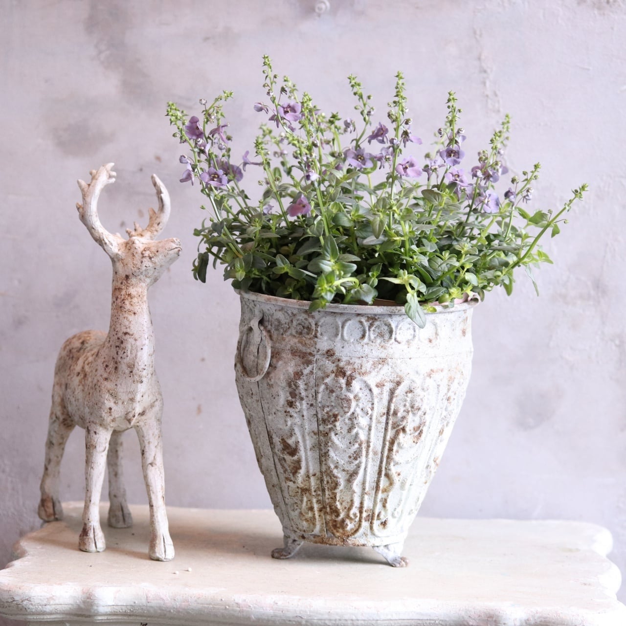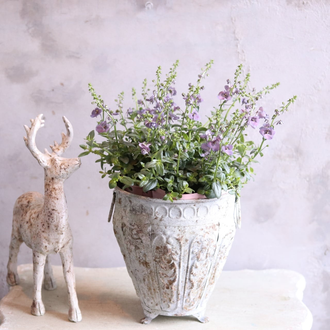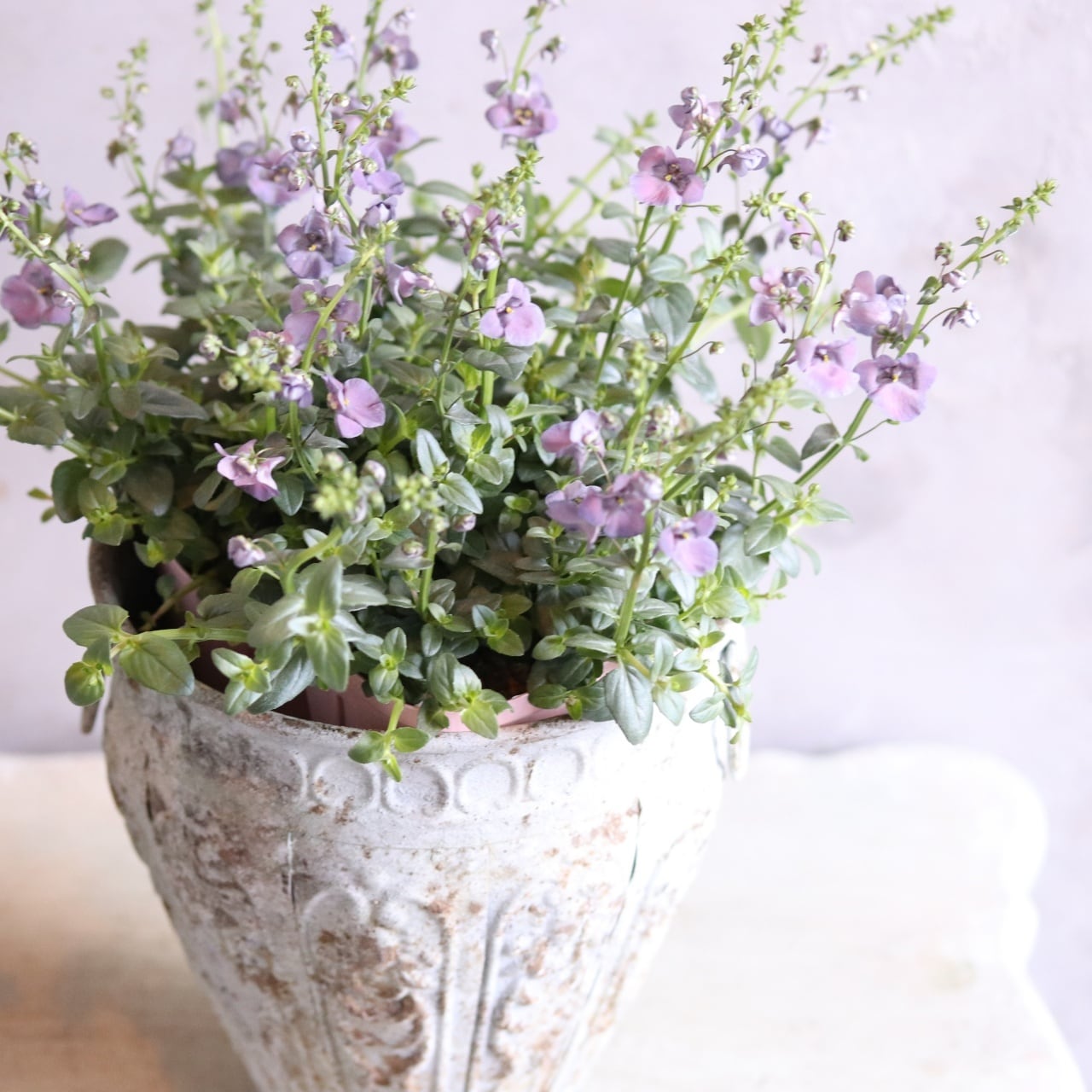 寄せ植えにも使えますがこちらのようなシャビーなポットに単色で植えると