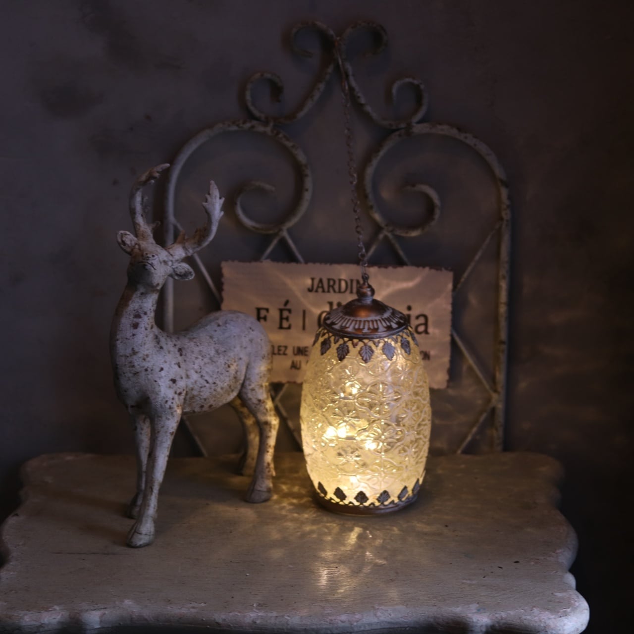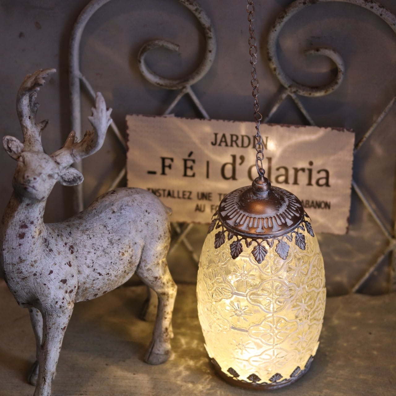 置くだけで空間がアンティークな雰囲気に変わり、やさしい光がほんのりと広がります。