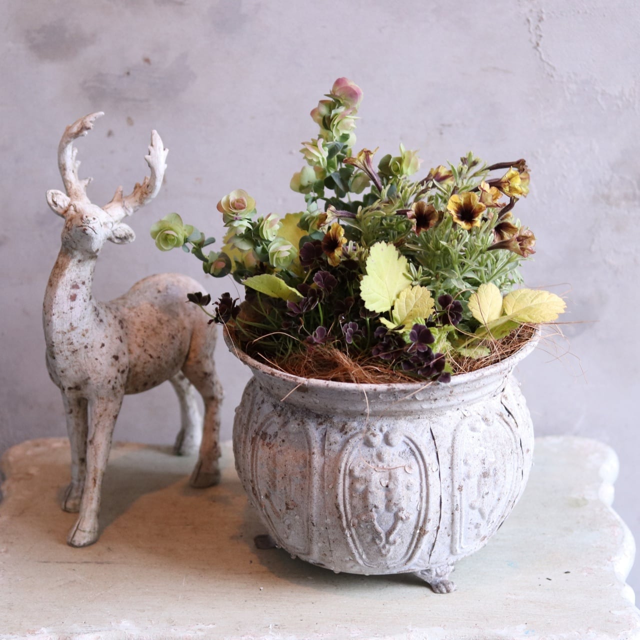シャビーなポットの寄せ植えを飾りたい。