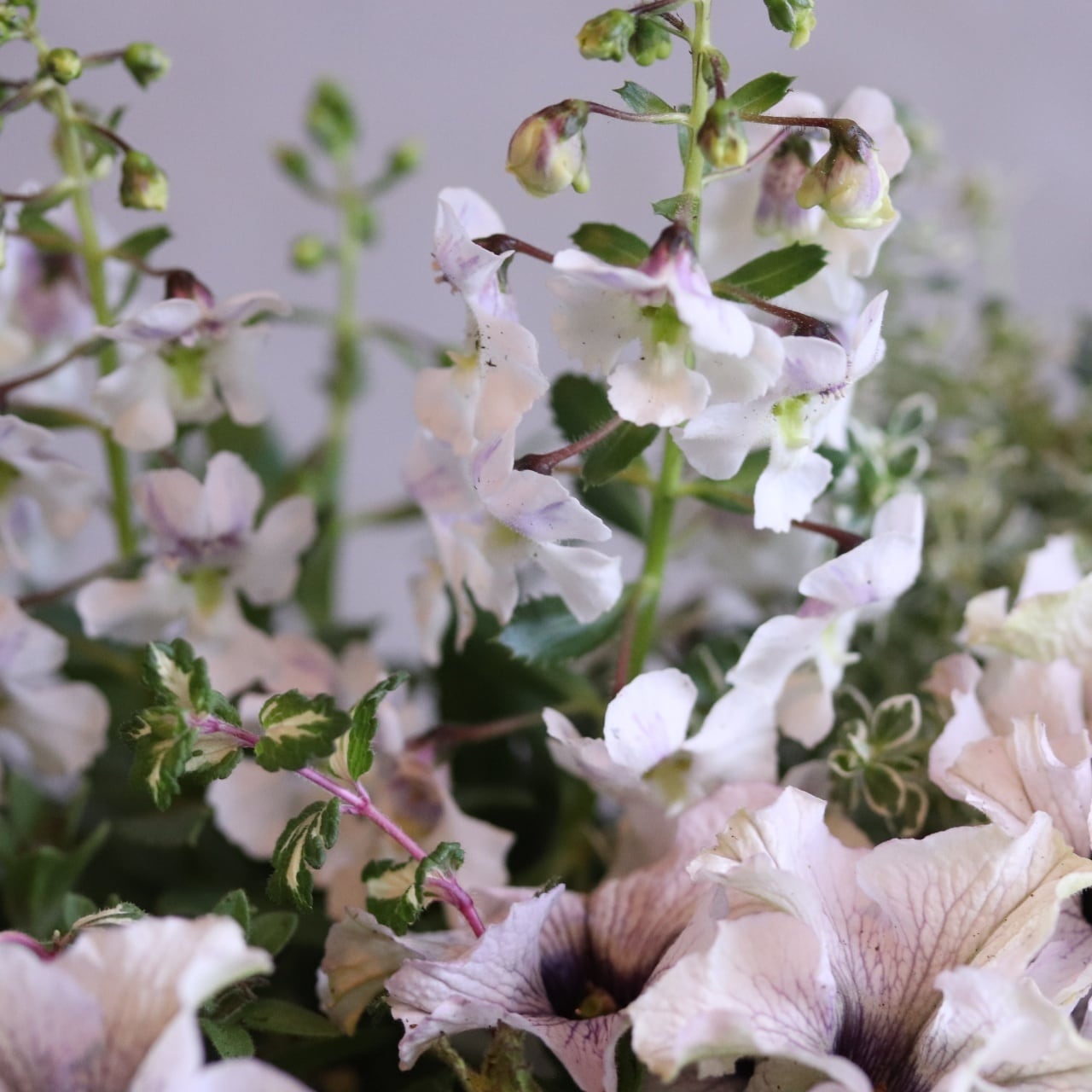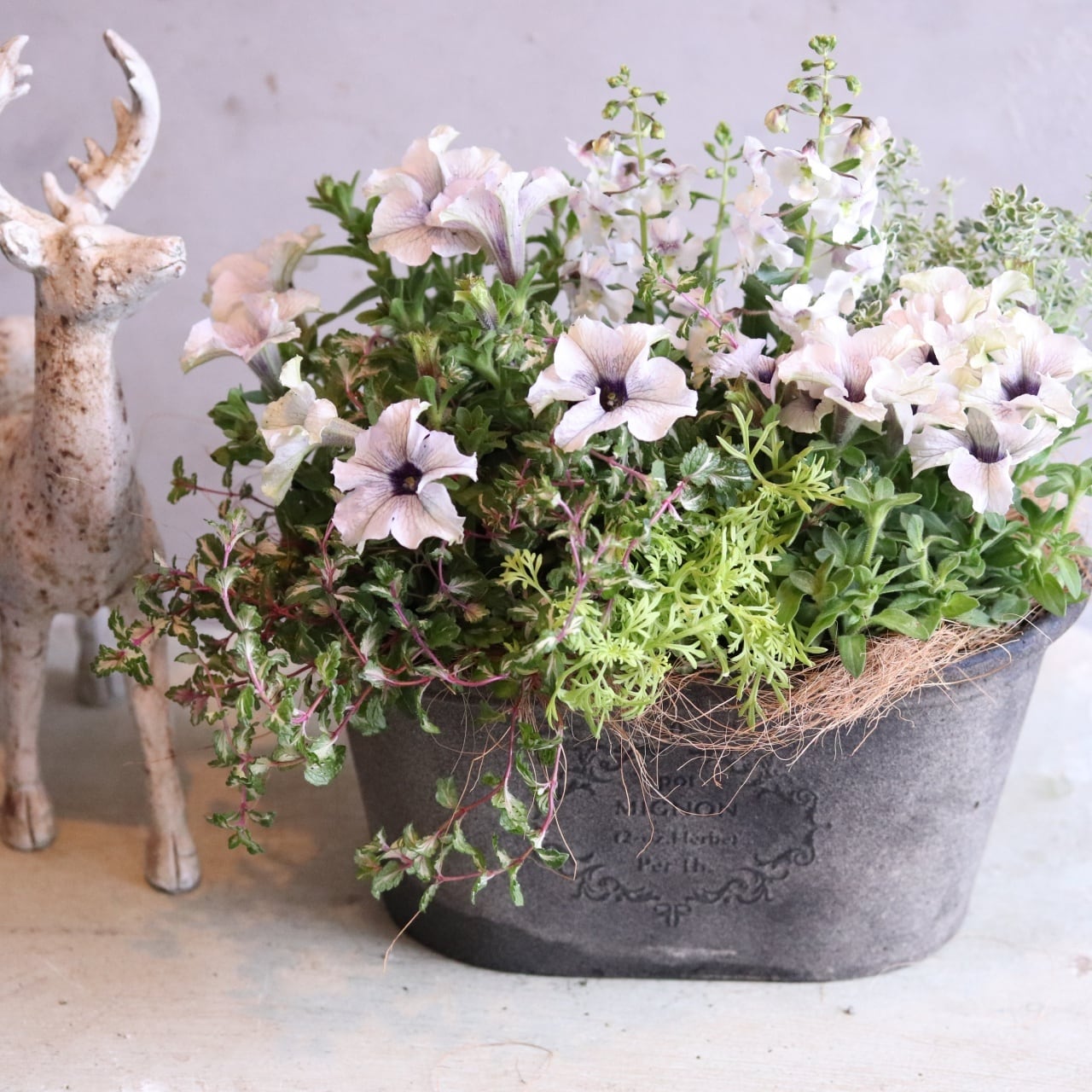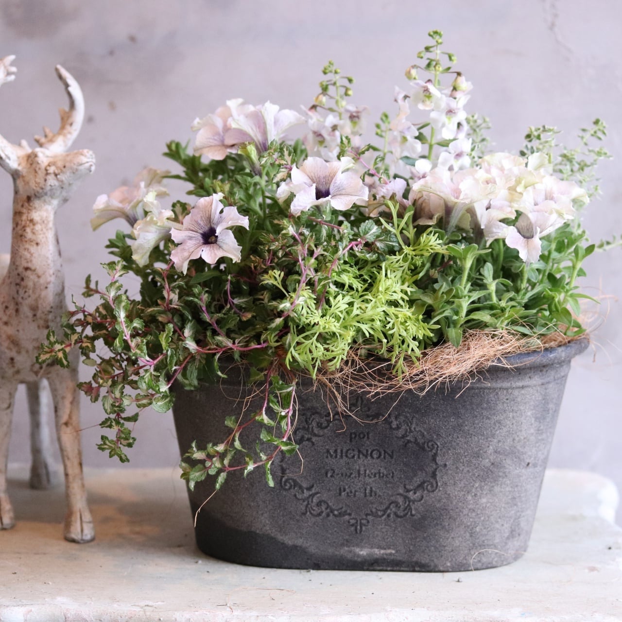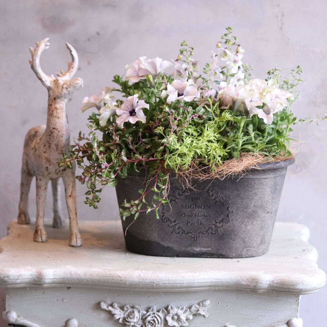 お花やリーフをモリモリ合わせたナチュラルシャビーな寄せ植えです。