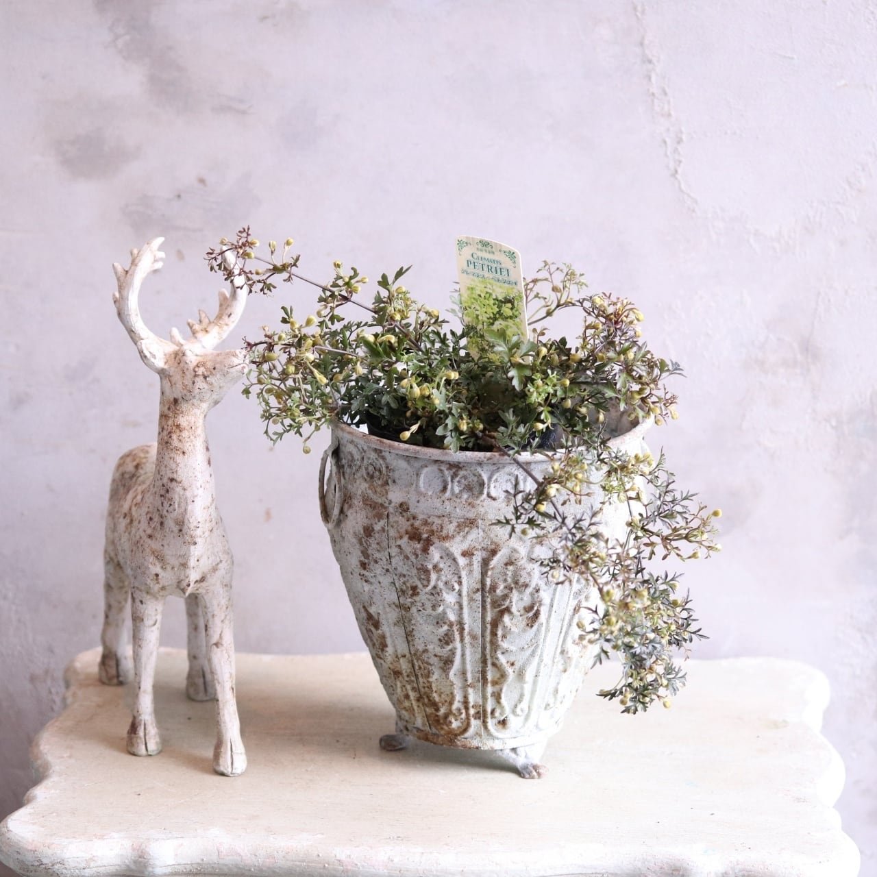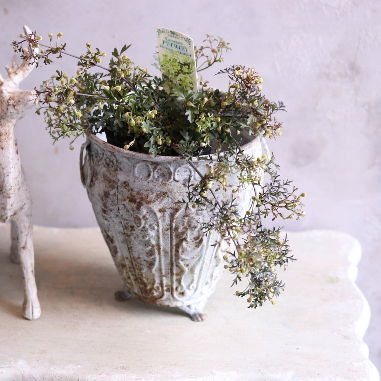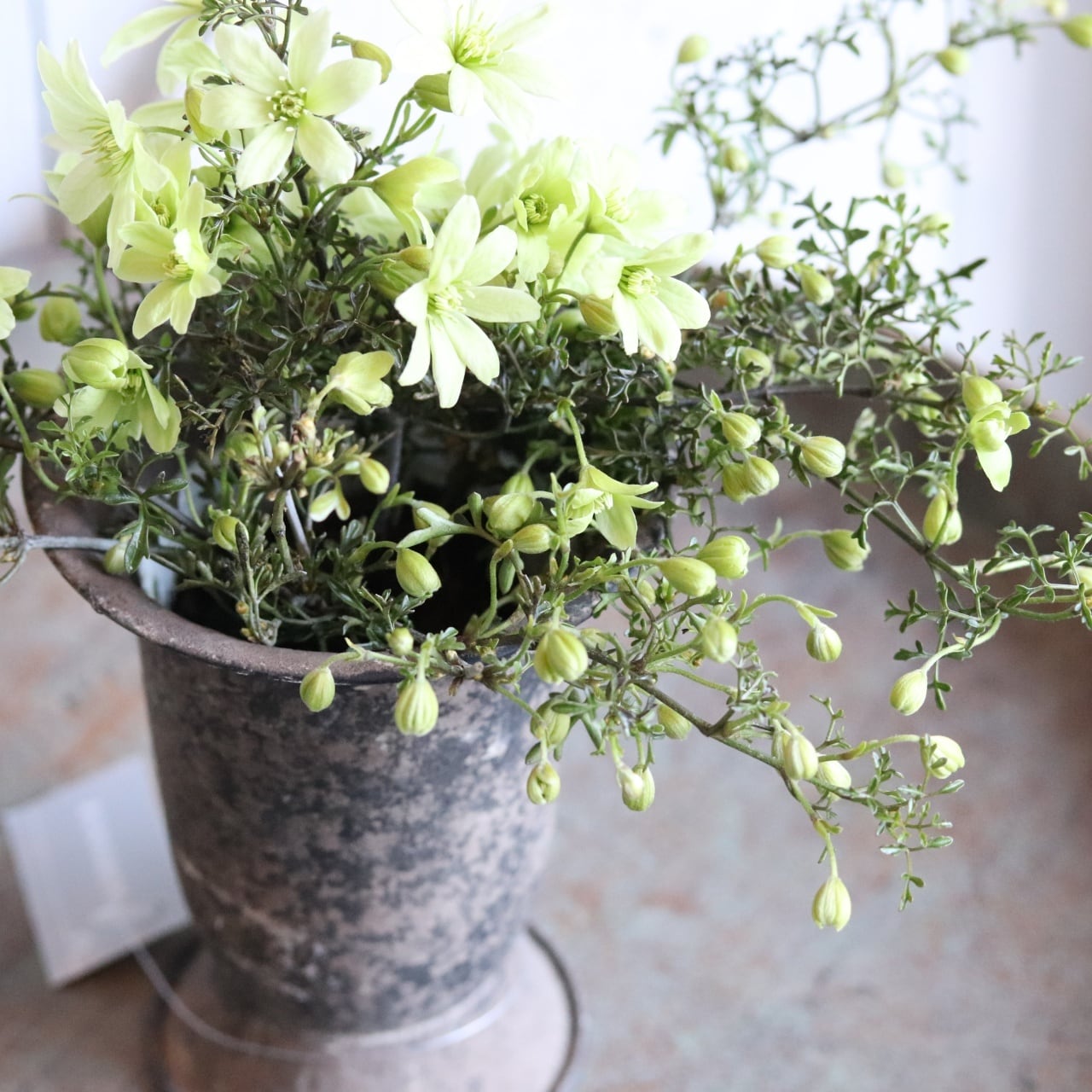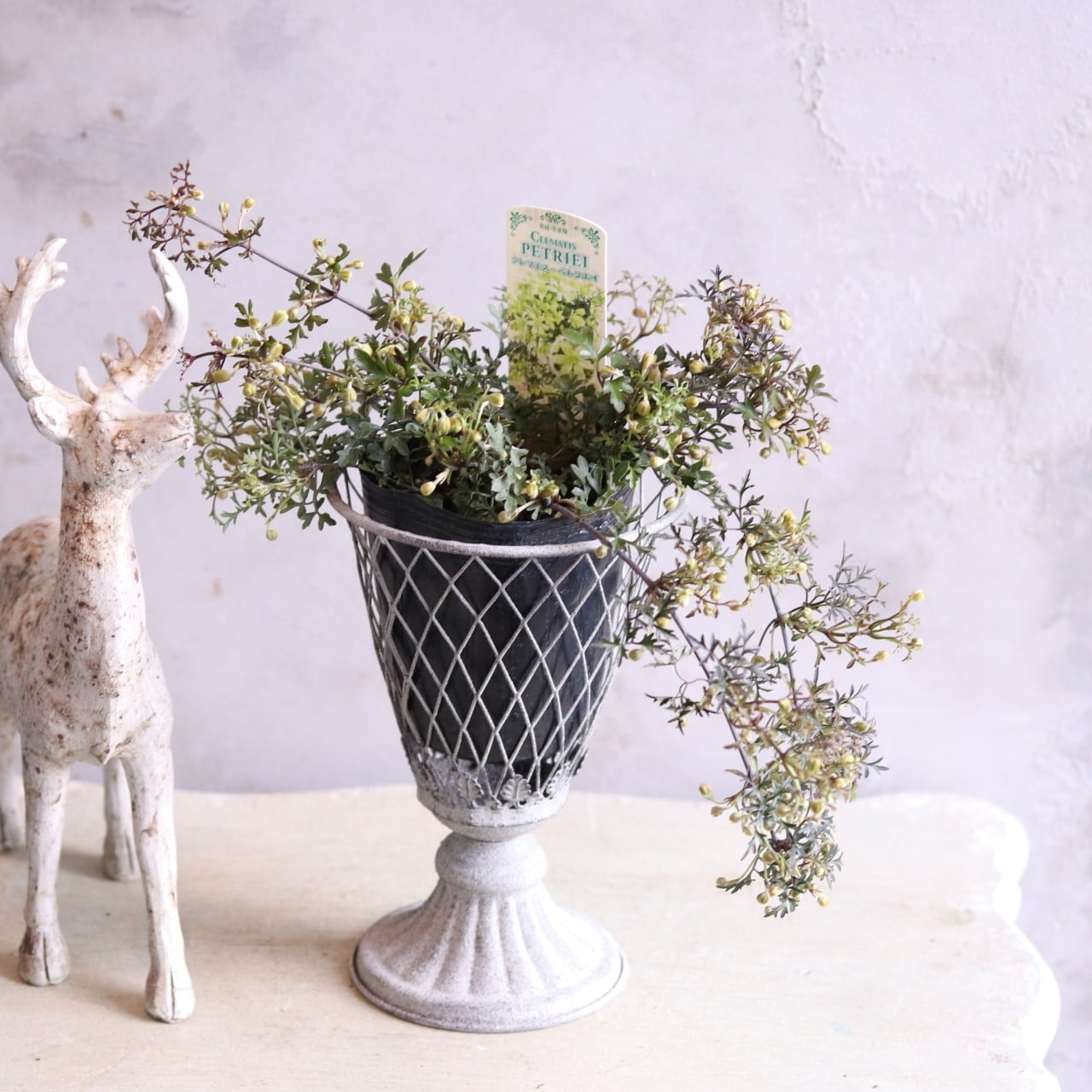 シャビーなポットによく似合うオシャレな一番人気のクレマチスペトリエ